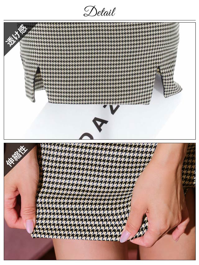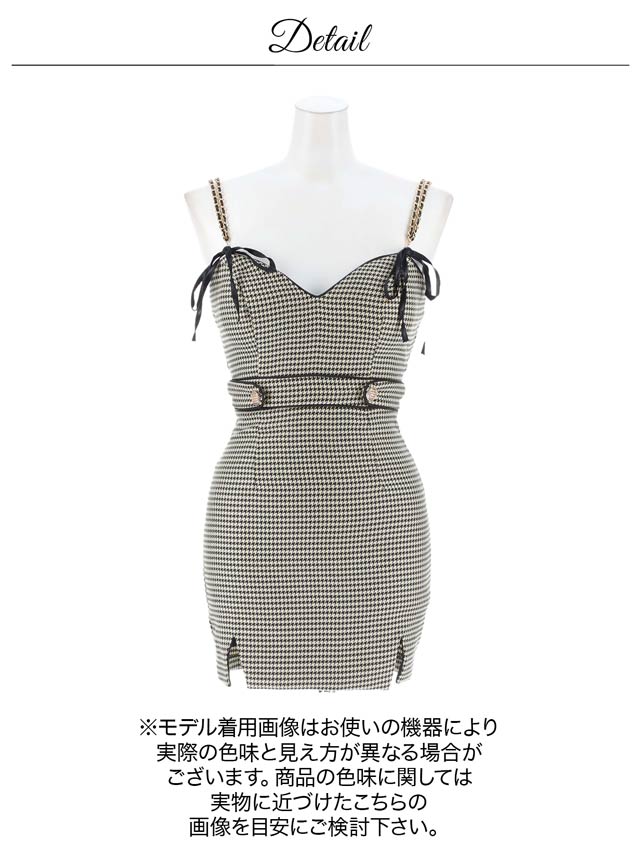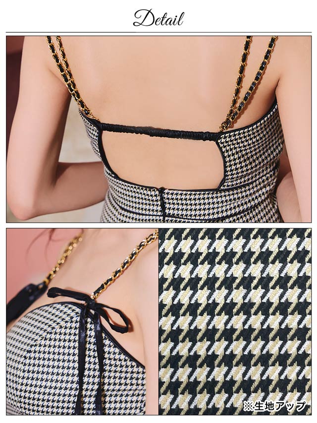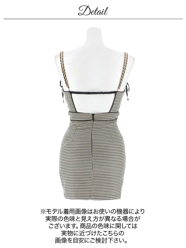 クラシカルな千鳥格子柄にウエスト部分がアクセントになったミニドレス。煌びやかなチェーンのキャミソールにリボン装飾を加え女性らしい印象に◎ 大胆に開いた背中見せが後ろ姿からセクシーさ溢れる1着です。