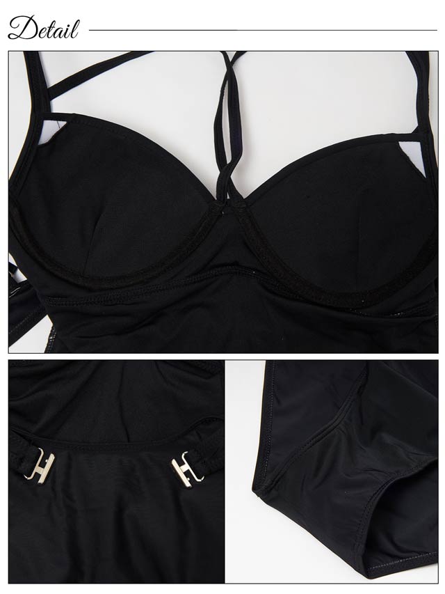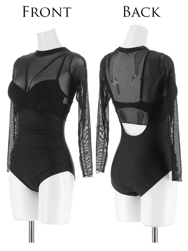 メッシュ素材の長袖トップスで日焼け対策ばっちり♪ 露出に抵抗がある方にもおすすめなワンピース水着。トップスを脱げばバストライン際立つストリングデザインのセクシーな着こなしへ大変身◎ 後ろの背中魅せホールもワンポイントになった1着です。