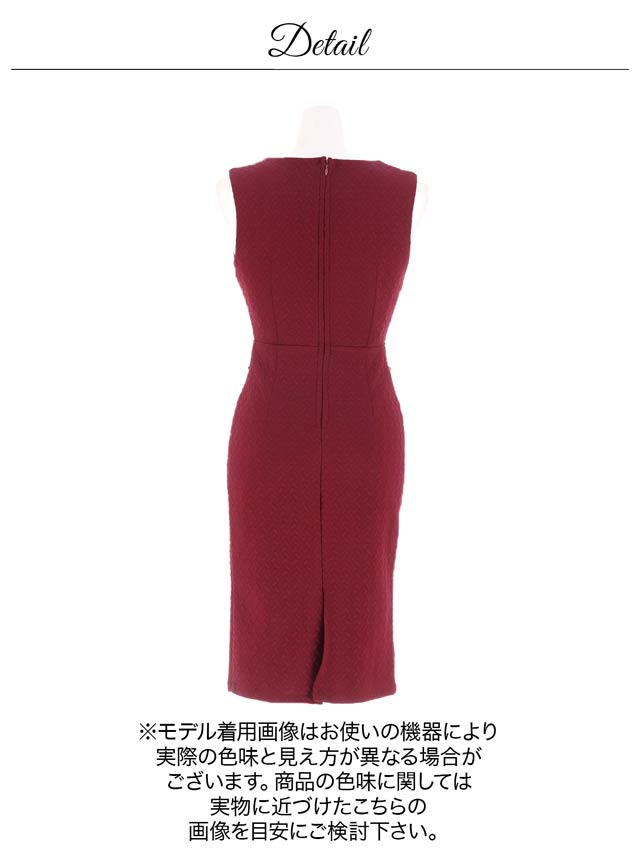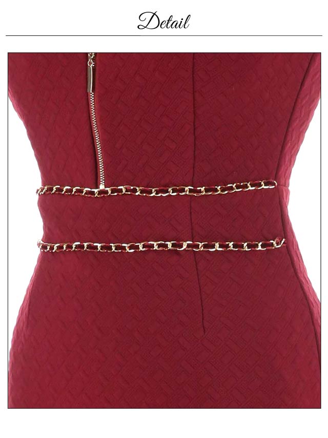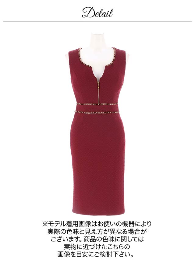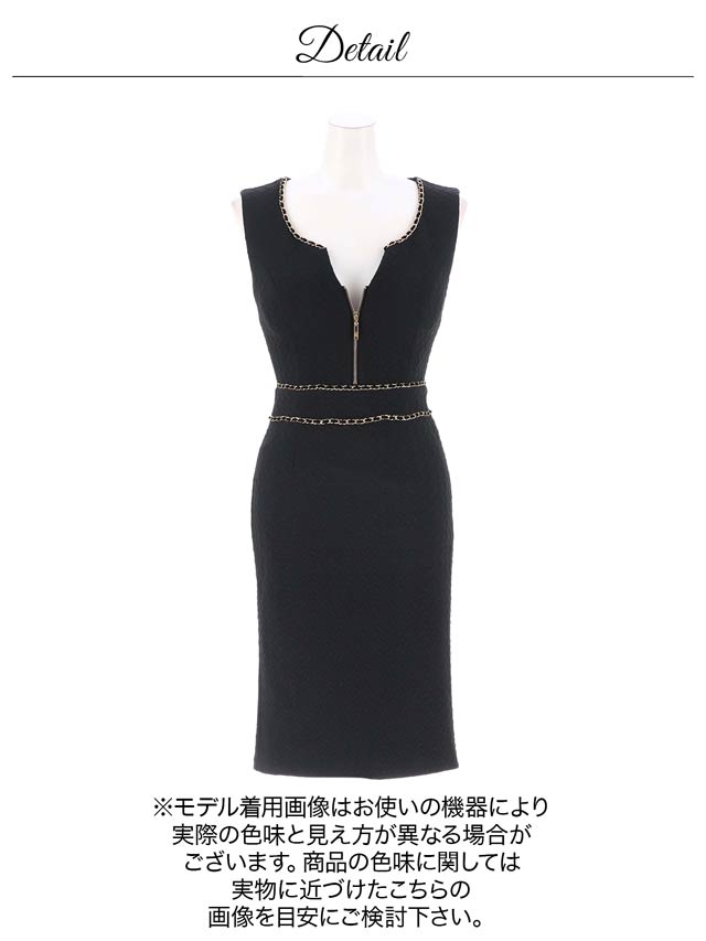 凹凸感のある幾何学模様に高級感漂うチェーンラインをあしらった膝丈ドレス。フロントジップ仕様なので谷間の開き具合がお好みで調整可能です◎ ハイウエスト切り替えが脚長効果も与えてくれる1着です。