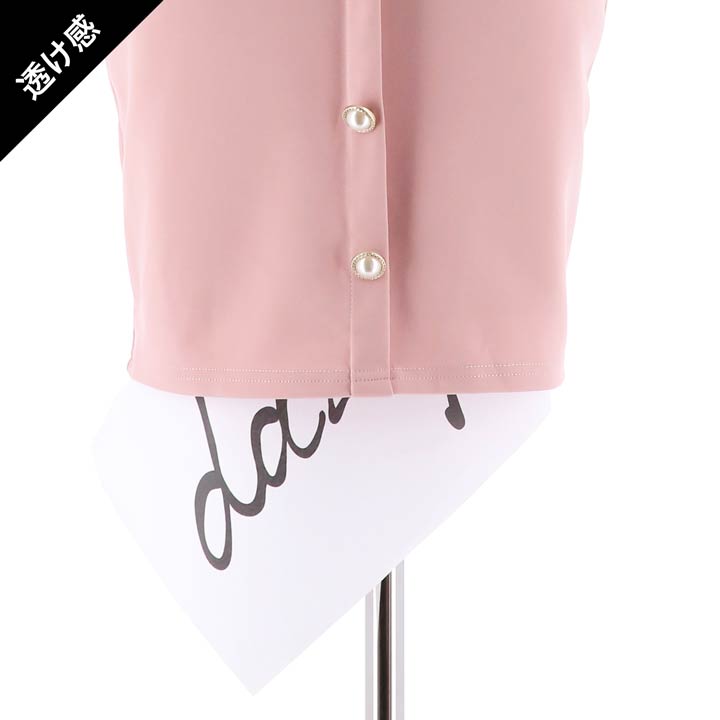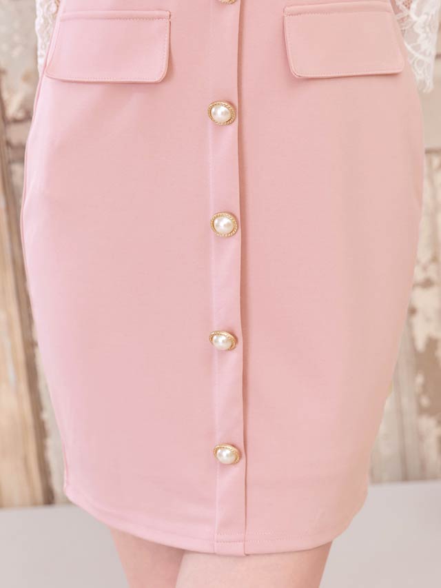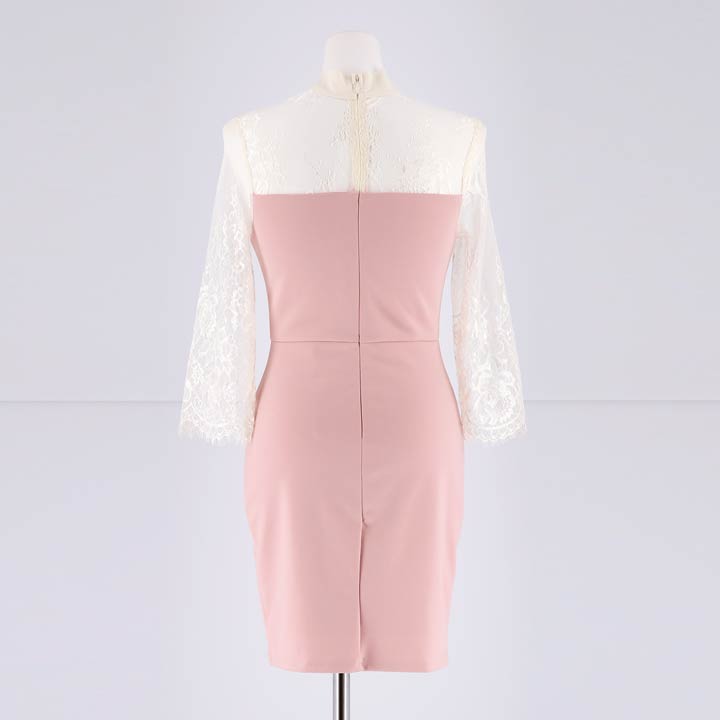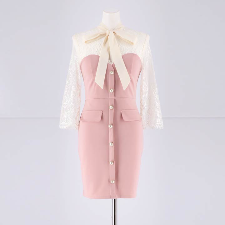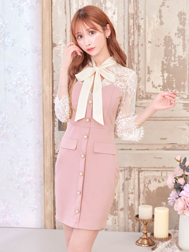 大きなネックリボンやパールボタンモチーフが上品ガーリーなミニドレス。デコルテやバックは繊細なレースでほんのり素肌を透け見せ♪七分丈のレーススリーブ付きで二の腕が気になる方にもおすすめです◎