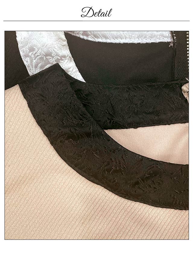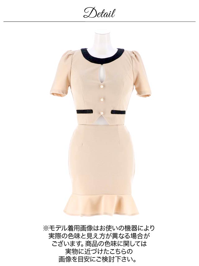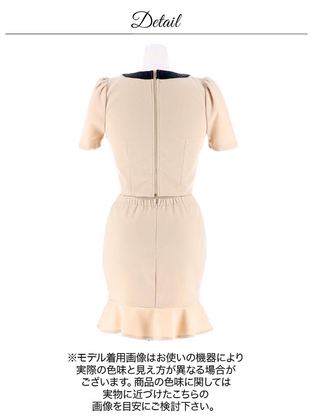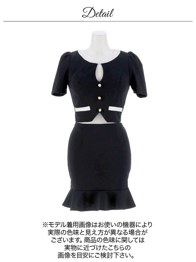ネックやポケットモチーフのバイカラー切り替えがアクセントになったセットアップ。細長な谷間ホールが上品に肌魅せ出来て女性らしい抜け感を与えてくれます◎ お腹をチラ見せできるスリットも色気漂う1着です。