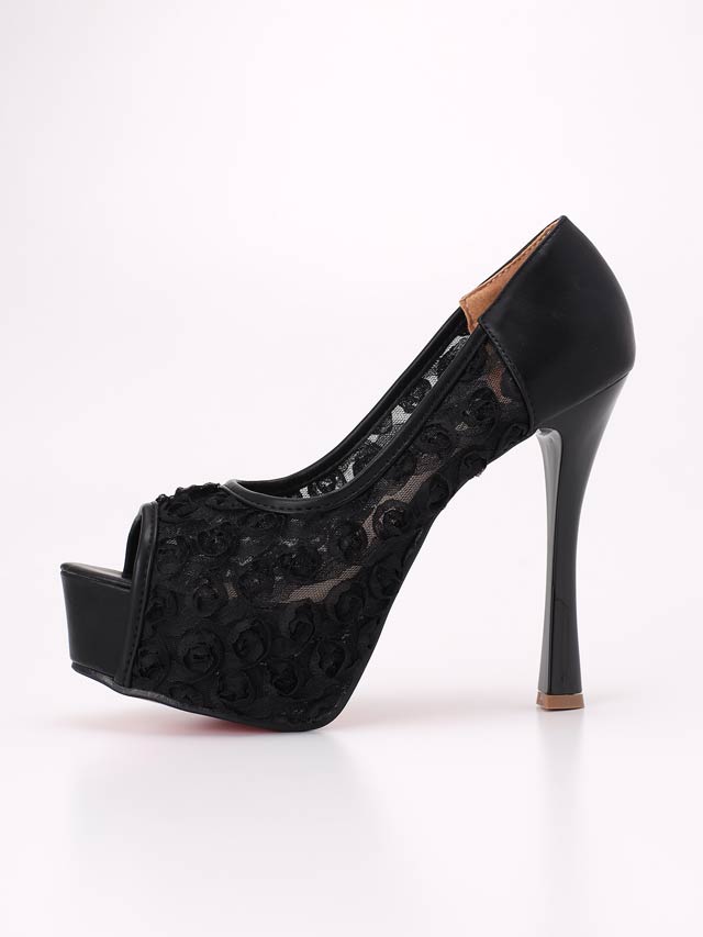 [dazzyオリジナル][13.5cmヒール]モノトーンレースオープントゥパンプス