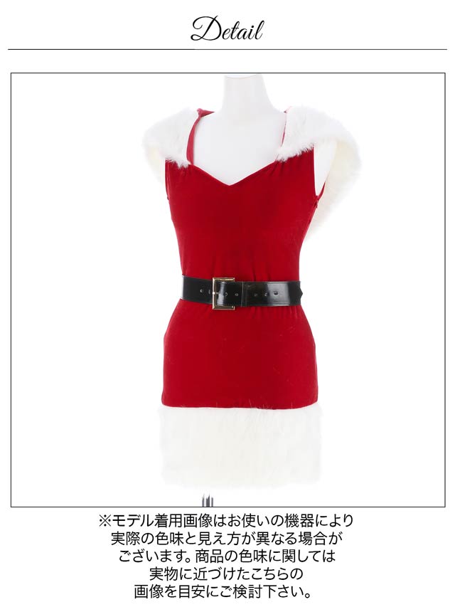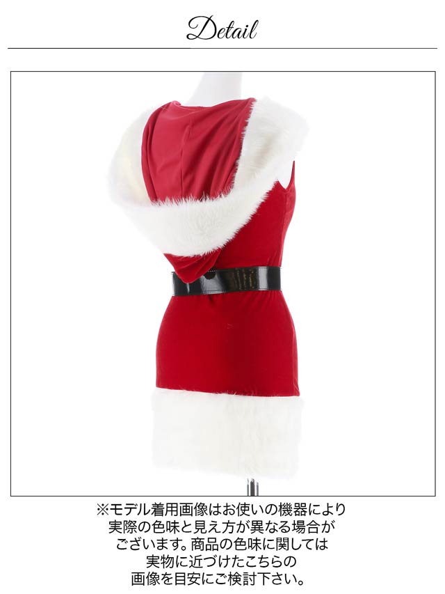 大き目なフードで可愛らしさと、程よい露出でセクシーさも取り入れたサンタコスチューム。ふわふわなファー素材のアームウォーマー&レッグウォーマーと、レッグウォーマーにあしらったリボンがポイント♪ドレス、ベルト、レッグウォーマー、アームウォーマーの4点セットです◎