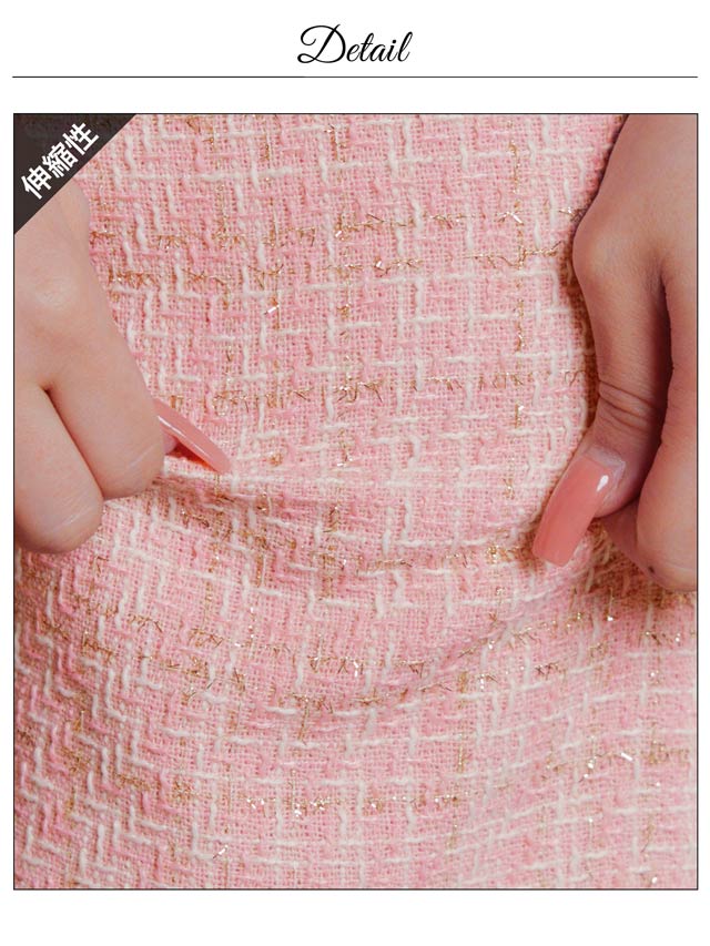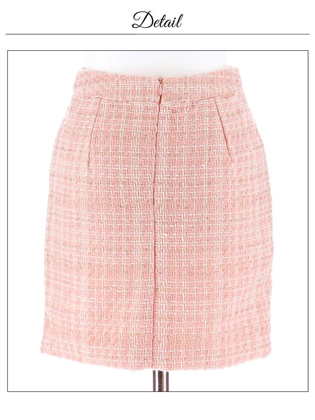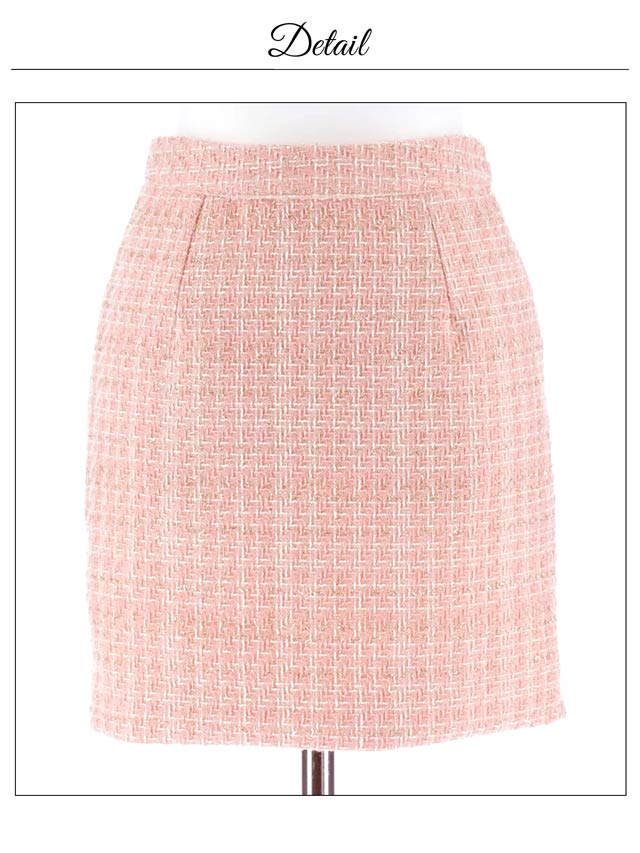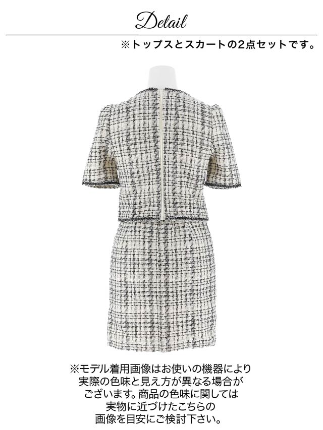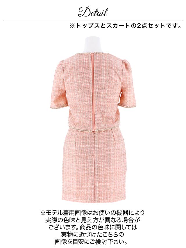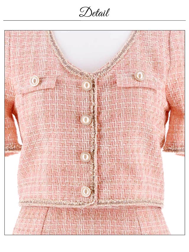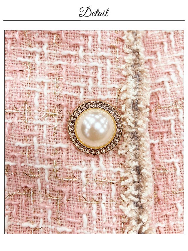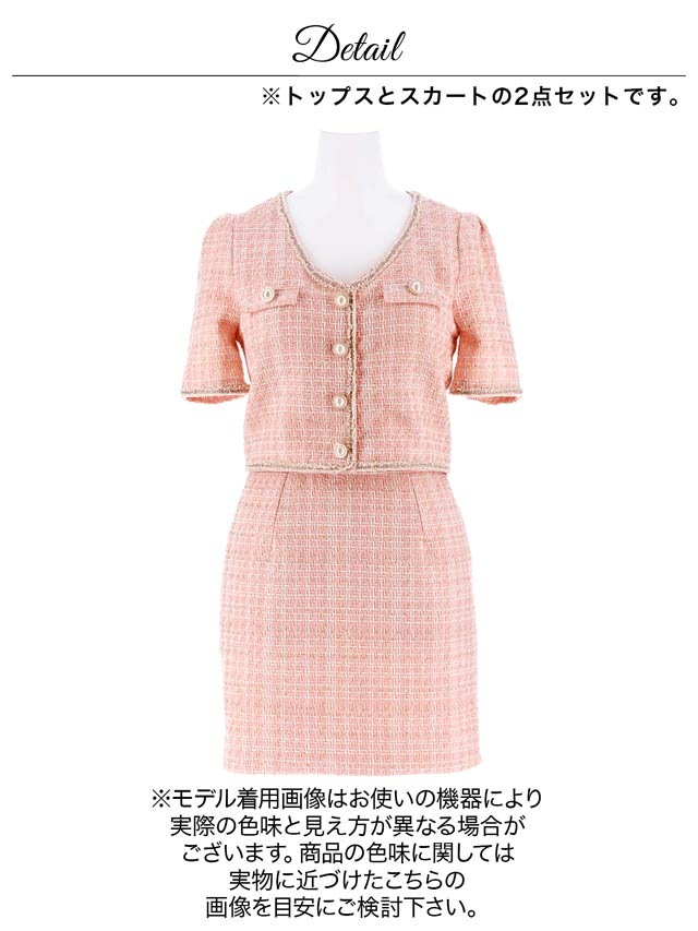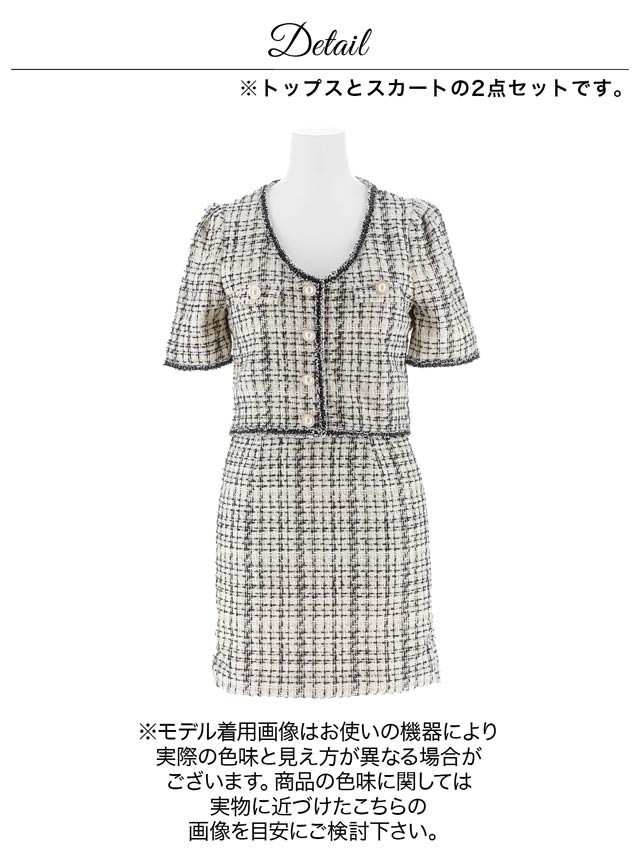 上品可愛いミックスツイードに大粒パールボタンがアクセントになった主役級セットアップドレス♪深めのネックデザインで首を長く見せてくれるので小顔効果も期待できます◎上下別々で着ても合わせやすく様々なコーデが楽しめる1着です!