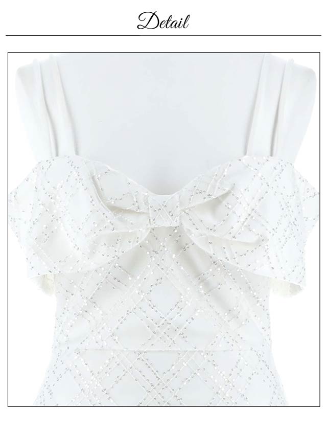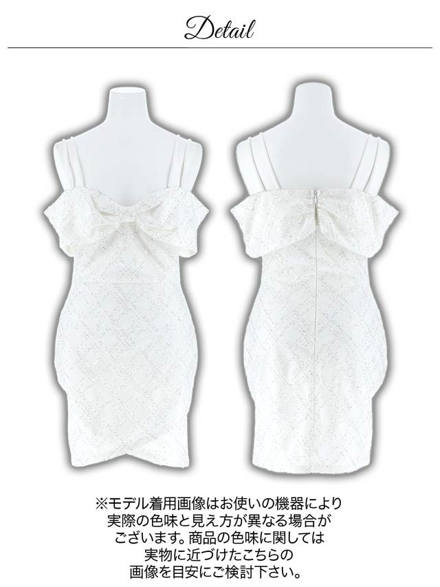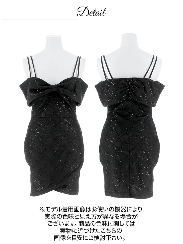 キラキラと輝く格子柄のラメ生地が存在感と華やかさを演出するミニドレス。リボン型にあしらわれたオフショルデザインが今っぽ可愛いワンポイント♪バストにボリュームを持たせメリハリ効果でスタイルアップ!大胆な肩見せのセクシーさとガーリー要素を取り入れた1着です。
