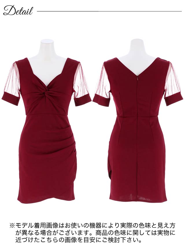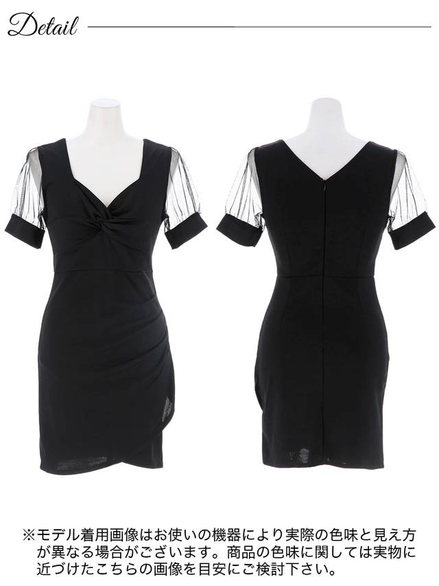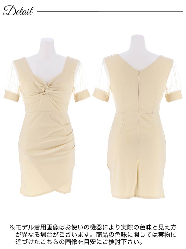 全体的にギャザー寄せしたデザインに胸元のツイストがアクセントになったミニドレス。場面を問わず使いやすいワンカラー仕様に、透け感のある半袖が程よく肌魅せも出来る1着です♪