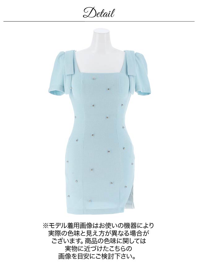 キラリと輝く大粒のラインストーンを散りばめた高見えドレス。女性らしいパフスリーブ部分にリボンを加え上品な甘さをプラスしました◎ 透け感のあるスリットから見える太腿が色っぽさを漂わせる1着です。