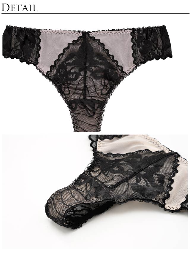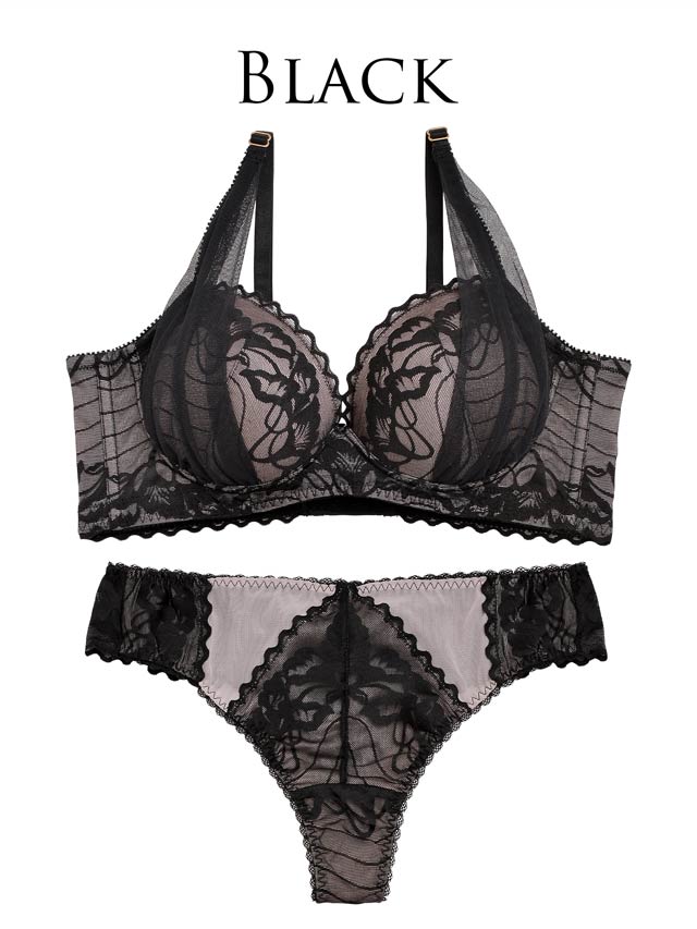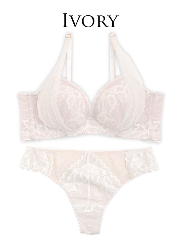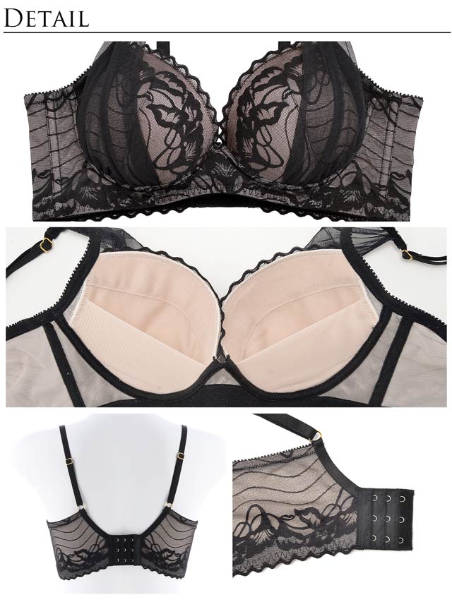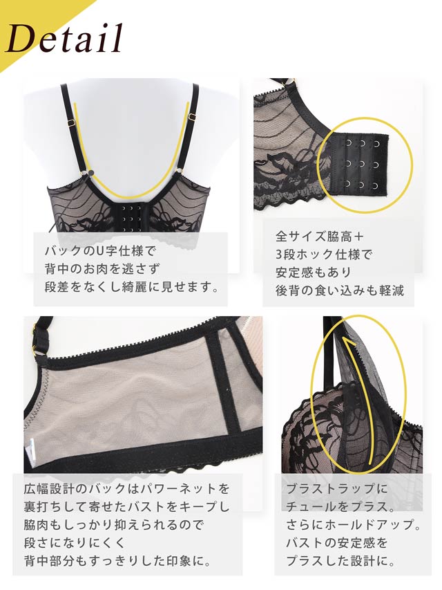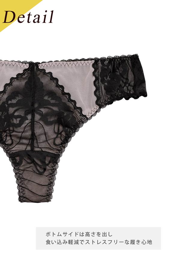 好評のZERO BRAシリーズ第二弾ランジェリー。 透け感のあるレースを採用し、肌なじみの良く着用できるように仕上げました。 カップサイドのチュールがバストの安定感をプラスし、綺麗にホールドしてくれます。 全サイズ3段ホック+脇高+U字バック仕様+下厚モールドカップで寄せたバストをしっかりキープ。 脇肉も抑えられ、段差になりにくくすっきりと見せてくれるブラジャーです。ボトムサイドが深めの設定で食い込みづらく、ストレスフリーで着用できるTバックショーツ。 フロントは肌当たりが優しいヌードのパワーネットで抜け感と透け感をプラスし、通気性も良く仕上げました。