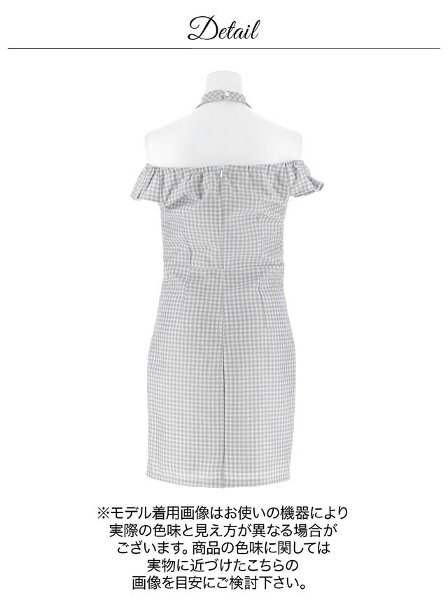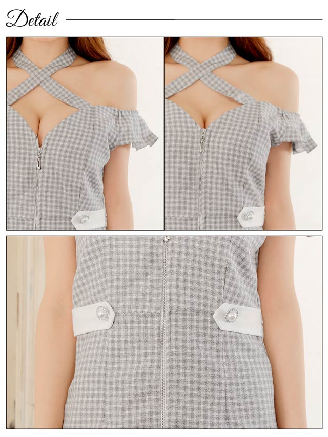 ギンガムチェック柄の生地にデコルテから首周りを華やかに演出するクロスネックがアクセントになったミニドレス。人気のフロントジップとキュートなフリルのオフショルデザインが甘さの中にもセクシーさをプラスした1着です。