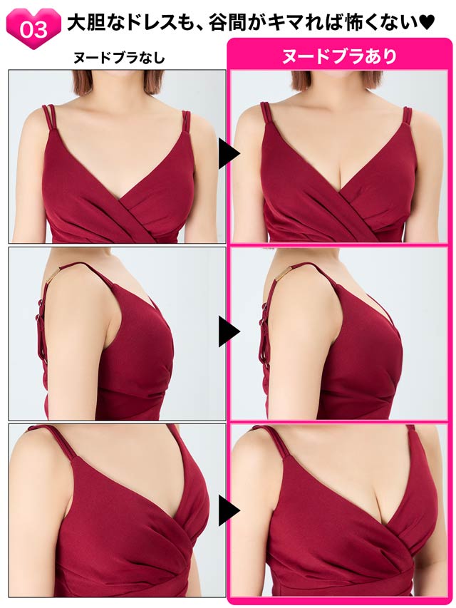 ドレスやお洋服の谷間の開き具合に合わせて谷間の見せ方を調整できるので、寄せすぎてお洋服からヌードブラが見えちゃう…なんてことが起こりにくいです!