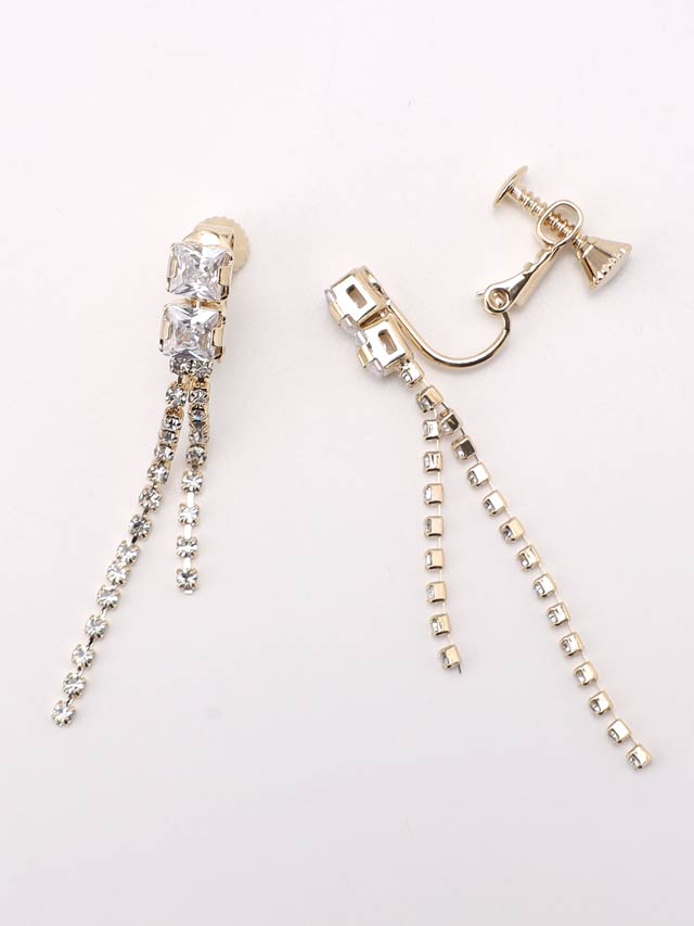 スクエア型ビジューから連なったチェーンが上品なイヤリング。細めな2連チェーンは女性らしい華奢な印象を与えつつ、お顔周りを華やかに飾ってくれる一品です◎
