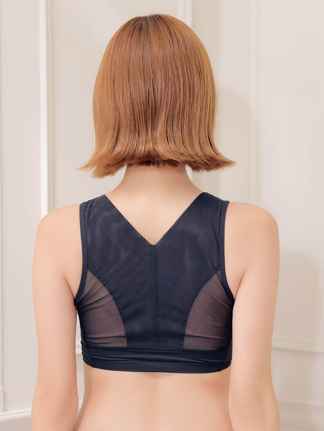 背中の2重のパワーネットを後ろ中心で伸び止めすることにより肩甲骨を引き寄せる美姿勢メイク。フルカップがバストを包み込み安心の着用感。アンダーもわさ仕様で食い込まず楽とキレイをかなえるハーフトップブラ。