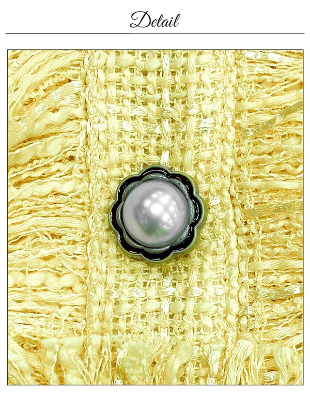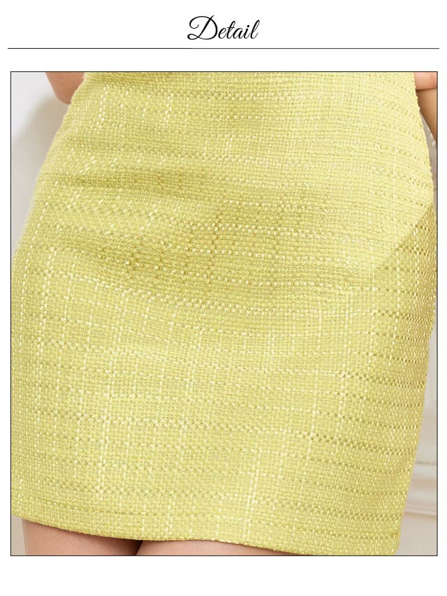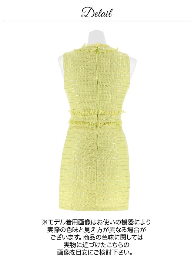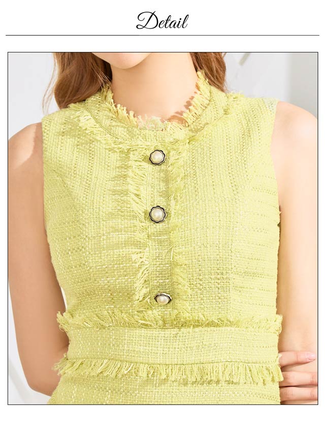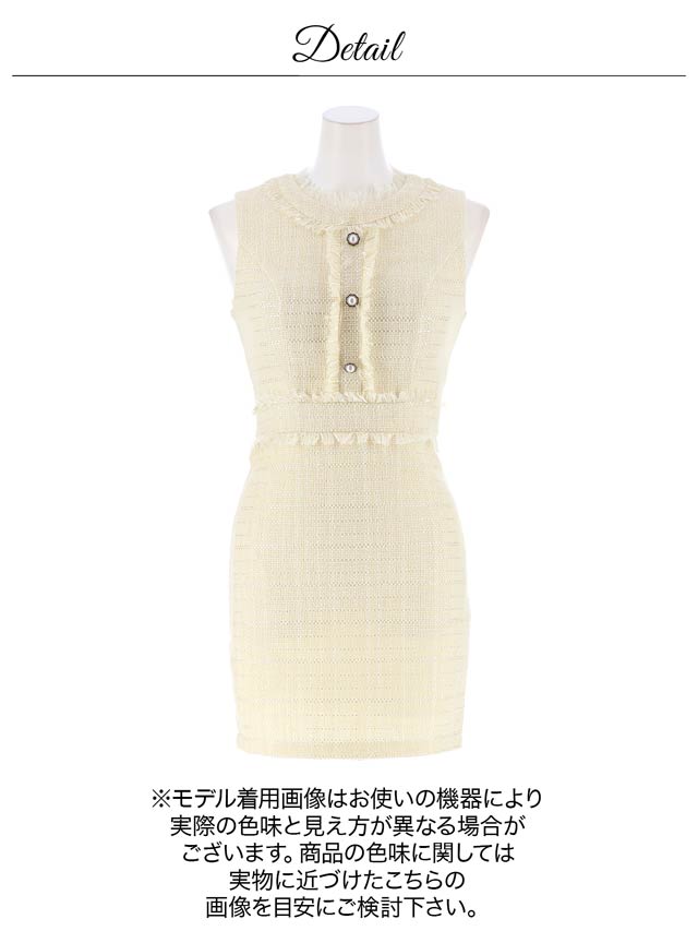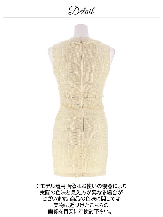 上品なツイード素材に甘めの色合いがポイントになったタイトシルエットのミニドレス。ノースリーブでほどよい肌見せも◎フロントにあしらわれたフリンジやパールボタンがドレスをさらに引き立たせてくれます♪