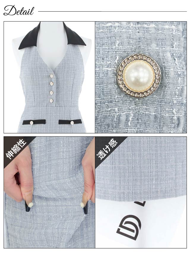 人気のツイードドレスを襟付き×ホルターネックで上品セクシーな仕上がりに◎バストラインを綺麗に見せる胸元のVカットや華やかなパールボタンもポイント。ブラックのフェイクポケットはアクセントになるだけでなくスタイルアップも叶えてくれます!