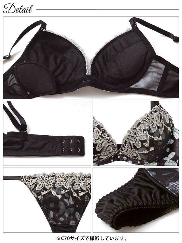 煌びやかな蝶のモチーフがプリント&刺繍されたランジェリー。チュール地に蝶が透けて上の刺繍がフェミニンなデザインです。中心のチャームがちょっぴりアクセントに♪ショーツは場面を問わず使いやすいTバック仕様です。