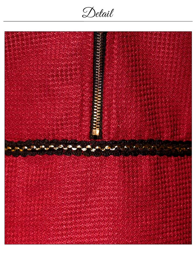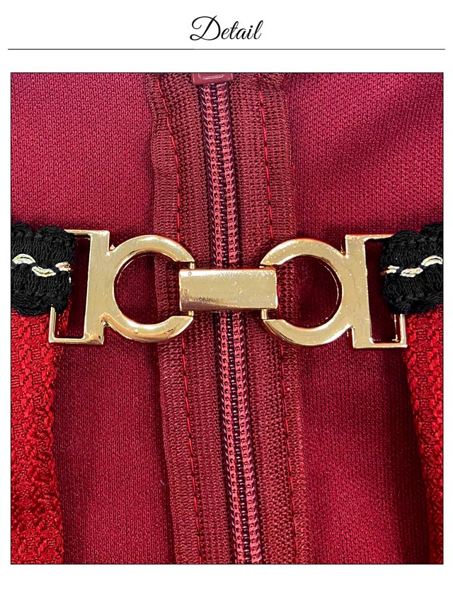 色鮮やかなワインレッドにゴールド×ブラックの刺?デザインが存在感溢れるミニドレス。首元にはキラリと輝くビジューと谷間ホールの肌魅せが目を惹くワンポイント◎ フロントジップを加え気分に合わせた谷間魅せコーデが出来る1着です♪
