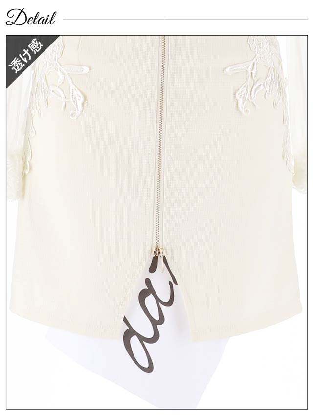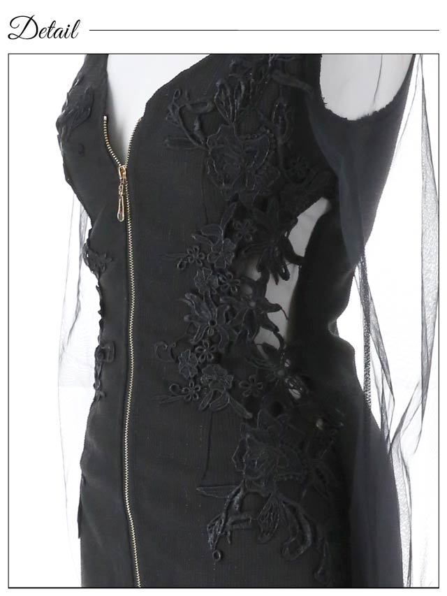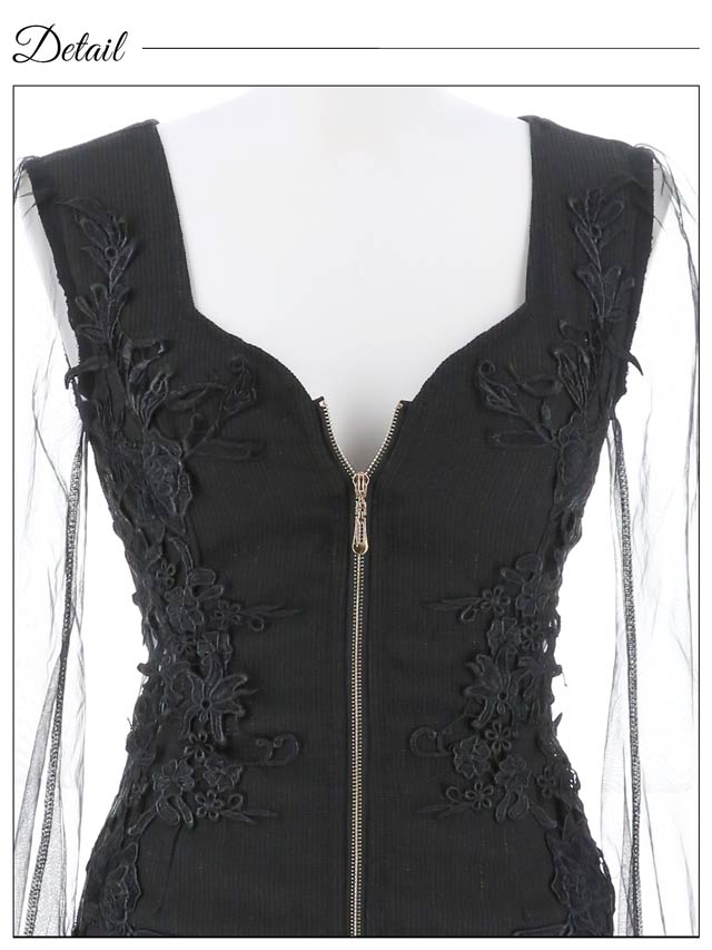 高級感抜群のフラワー刺繍×ウエストカットと人気のフロントジップが合体したミニドレス。フロントジップ仕様で谷間の調整可能です◎ 透け感のあるチュール長袖で二の腕の細魅せも出来ちゃう1着です♪