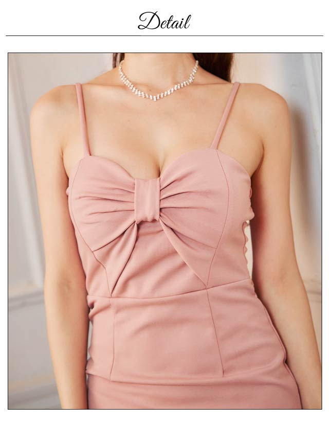 大人っぽさ漂うダスティピンクに、バスト部分の大きなリボンモチーフが視線を惹きつけるミニドレス。立体感のあるリボンがバストラインに自然なボリュームをもたらし、スタイルアップ効果も◎ 華奢な肩まわりやデコルテを美しく魅せるキャミソールデザインで、女性らしさをしっかりアピール。甘さの中にセクシーさも感じられる、主役級の1着です♪