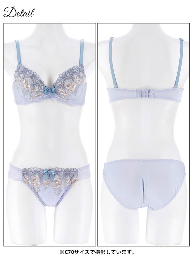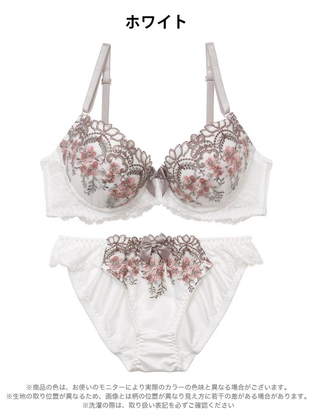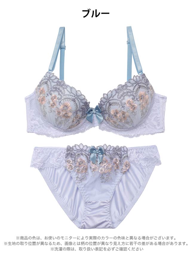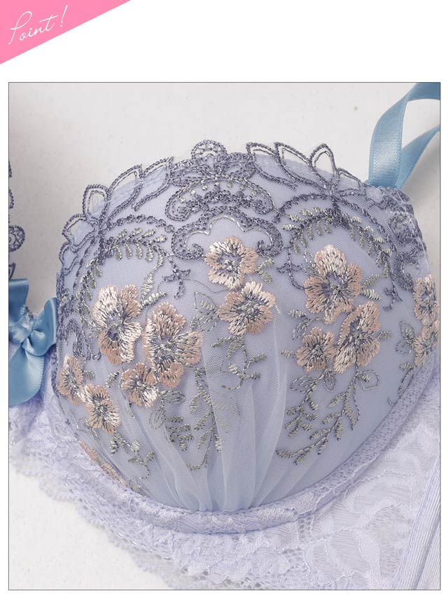 繊細な花柄刺繍を施したチュールレースが胸元を可愛らしく飾るランジェリー。中央にあしらわれた大きめのリボンが、甘く女の子らしい雰囲気をプラスします。アンダー部分やショーツのサイドにはレースを使用し、上品さも兼ね備えたデザインです♪