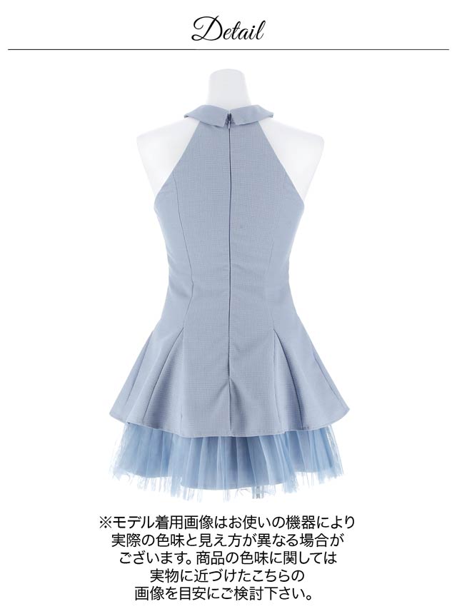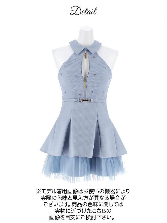 上品な襟元にアメスリ×フロントファスナーが色気を引き立たせるミニドレス。キラリと輝くラインストーンを散りばめ高級感を演出します◎ チュール素材を使用したティアードデザインのAラインシルエットが大人かわいい着こなしを叶えます♪