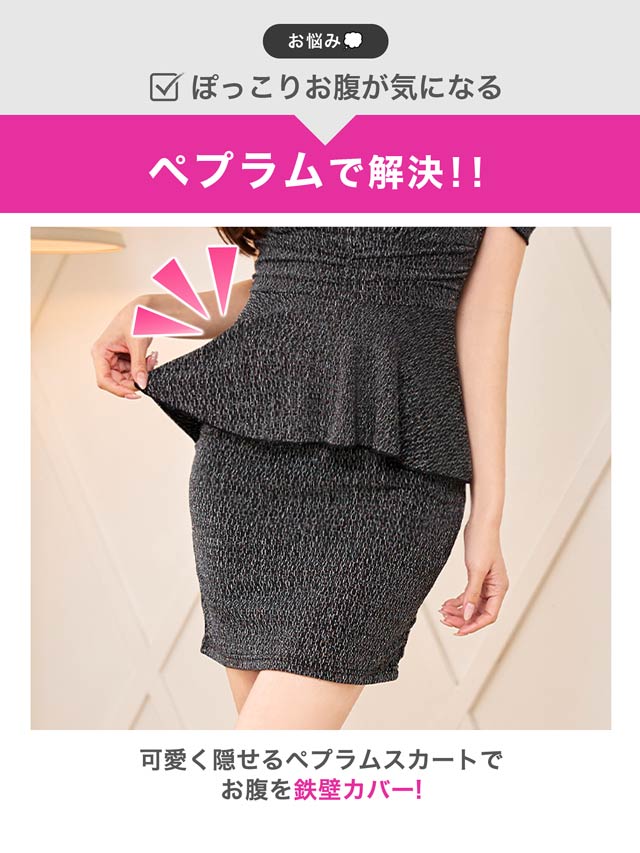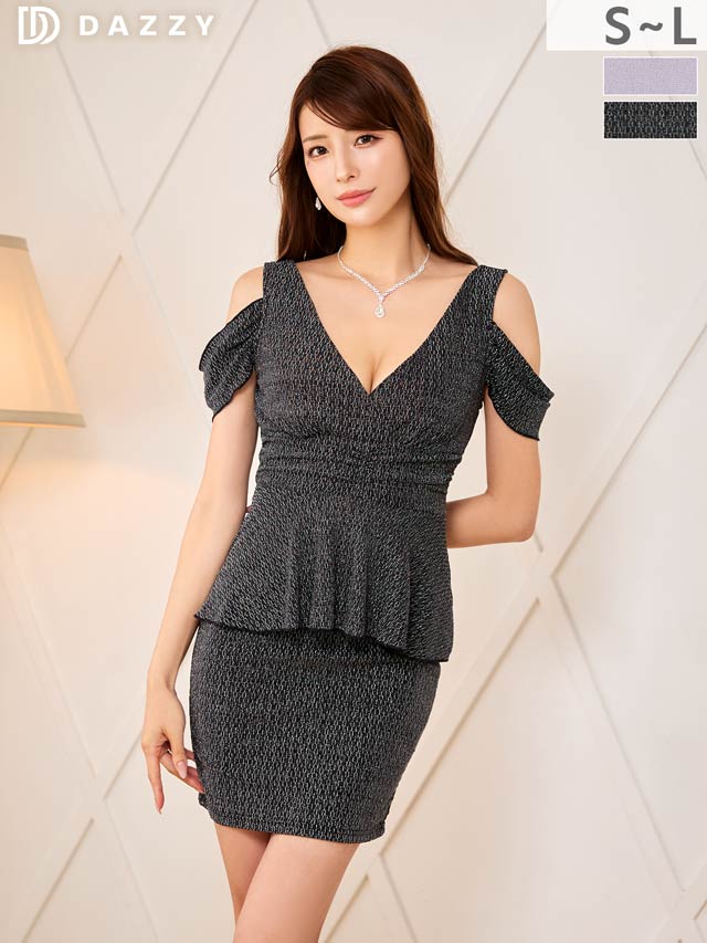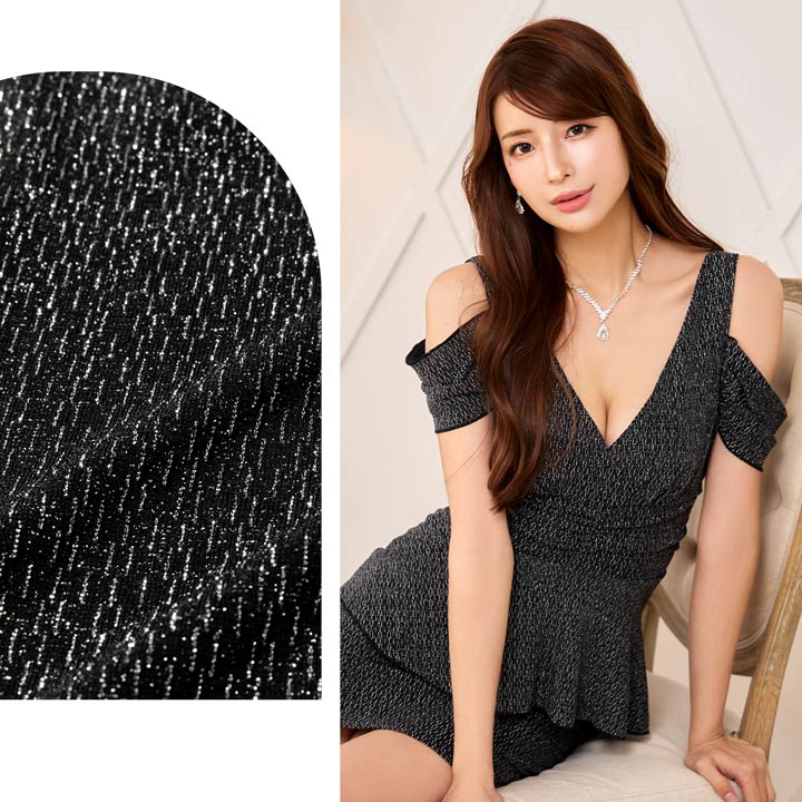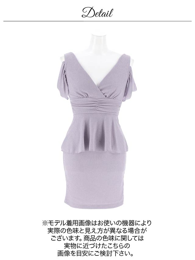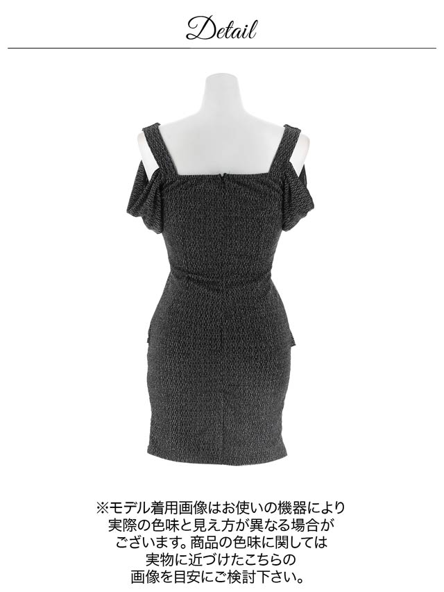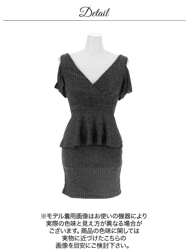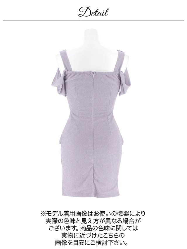 上品なラメ糸と腰回りを細見せするぺプラムシルエットが美しいミニドレス。伸縮性のある生地感にカシュクールの胸元がバストラインを際立たせ視線を集めます◎ 肩周りをチラッと見せられるオフショル仕様も魅力的です。