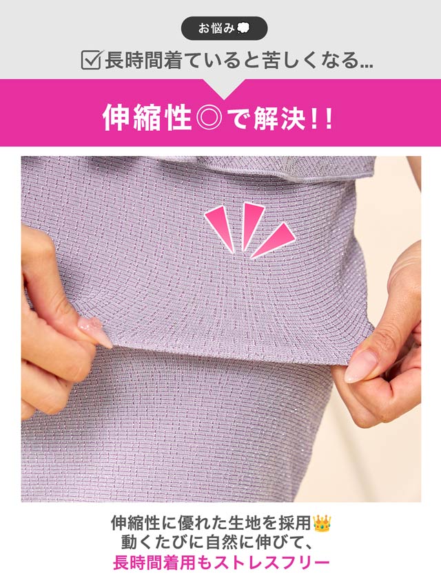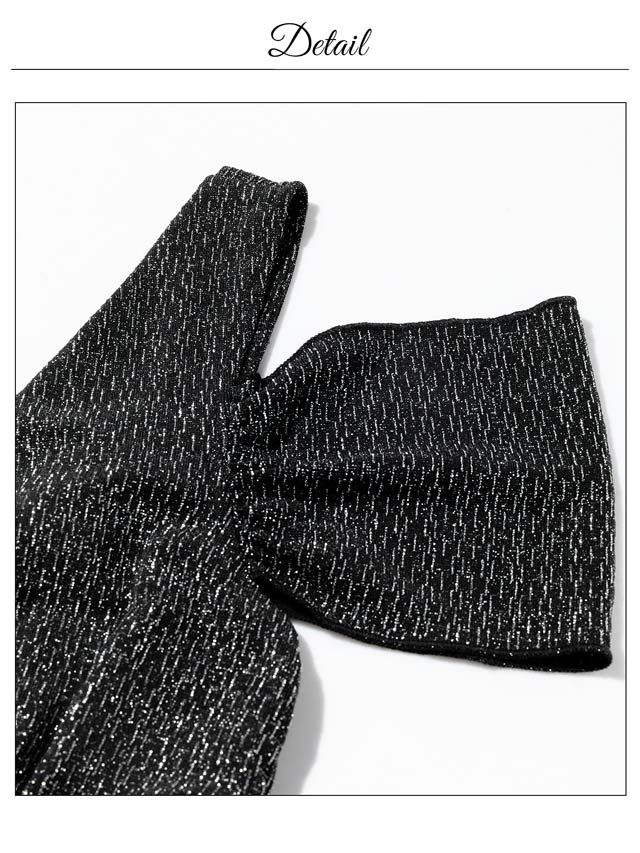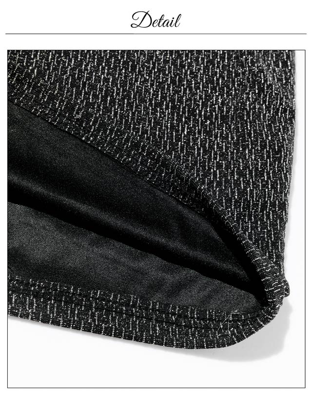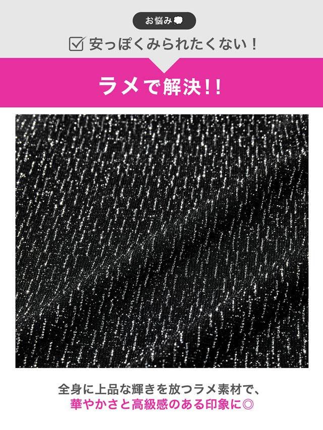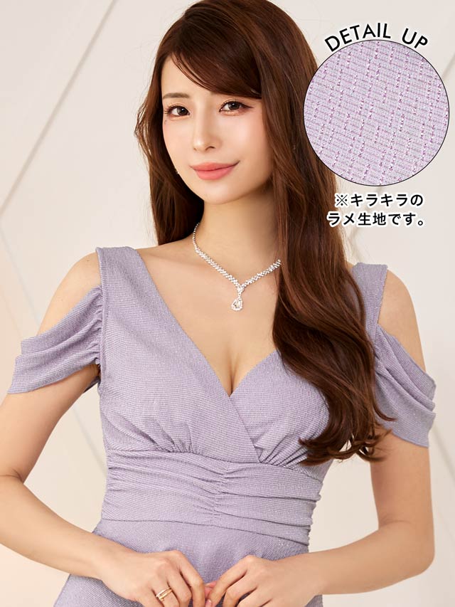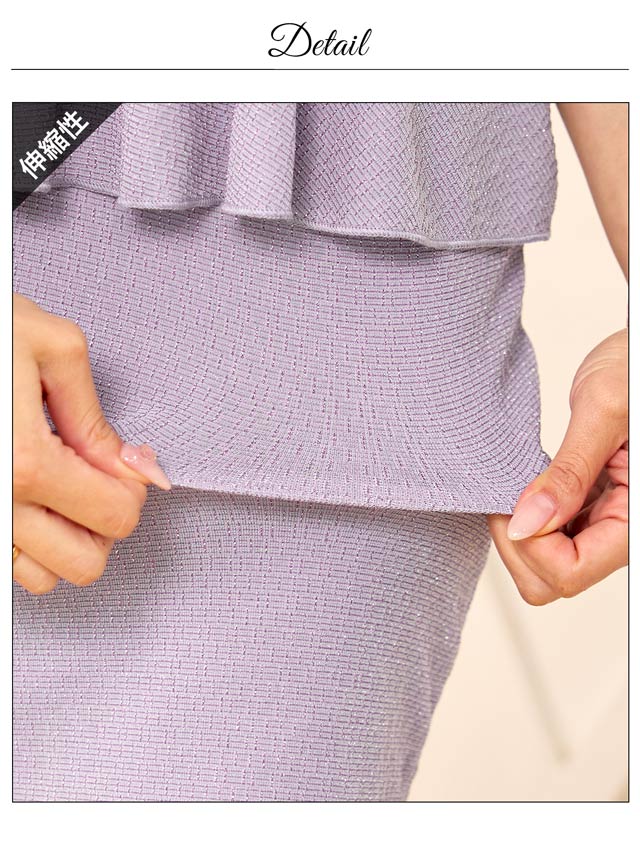 上品なラメ糸と腰回りを細見せするぺプラムシルエットが美しいミニドレス。伸縮性のある生地感にカシュクールの胸元がバストラインを際立たせ視線を集めます◎ 肩周りをチラッと見せられるオフショル仕様も魅力的です。
