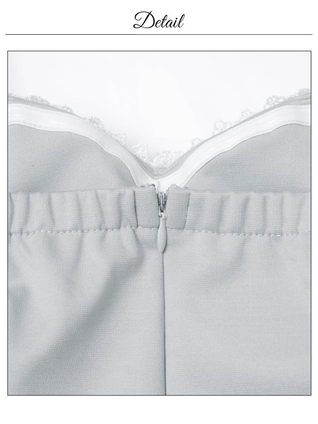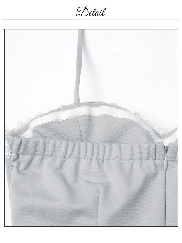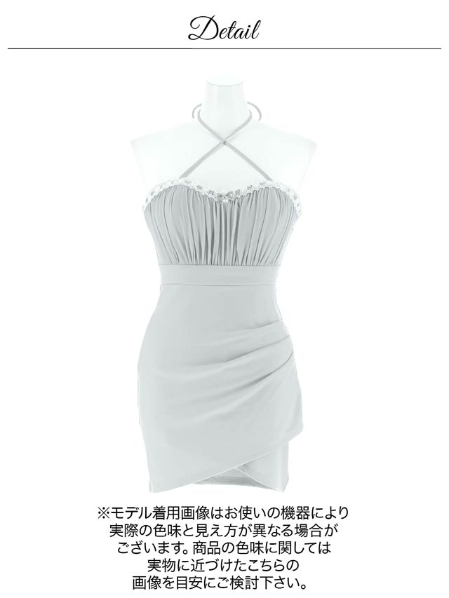 胸元のギャザーとリボンレースが甘めセクシーなキャバドレス。清楚 ×フェミニン な印象を与えてくれるくすみカラーで透明感UP◎ クロスされた華奢なホルターネックは首元や鎖骨を引き立たせる1着です。