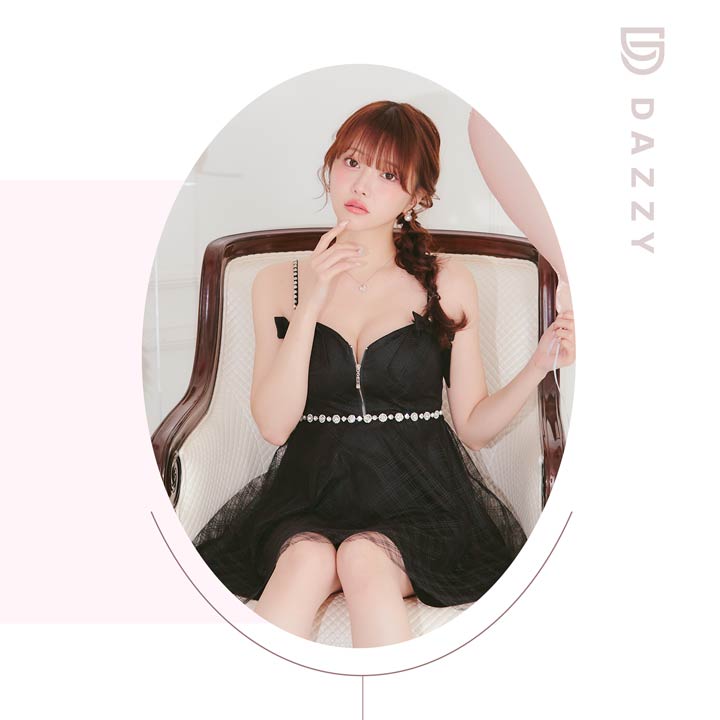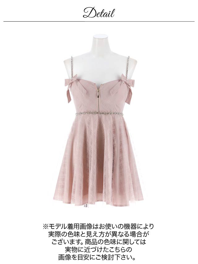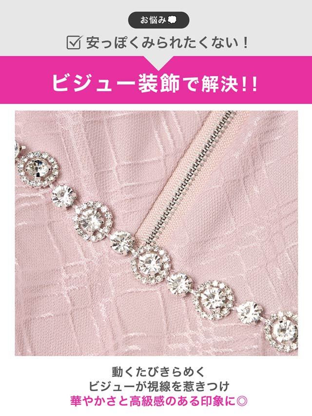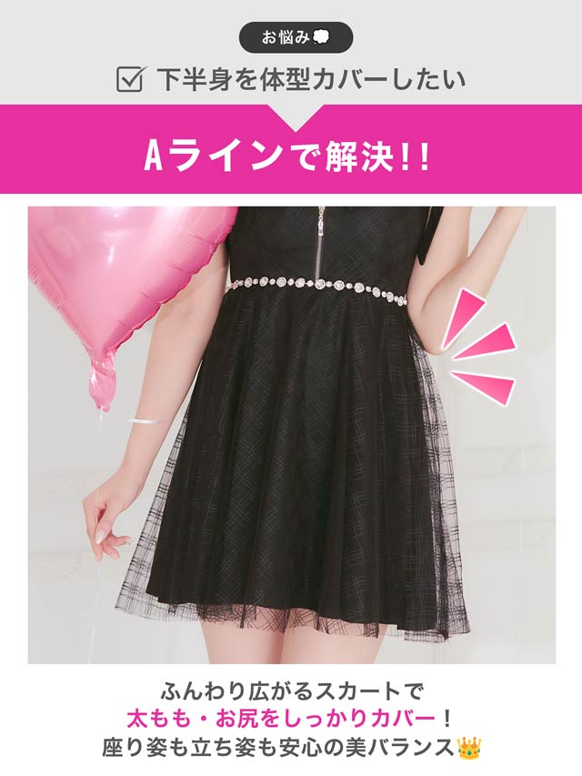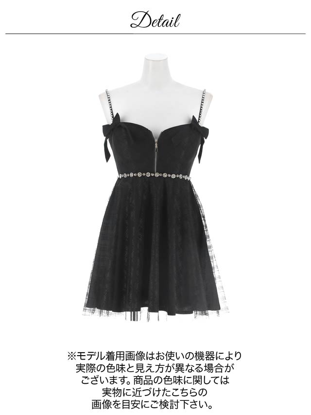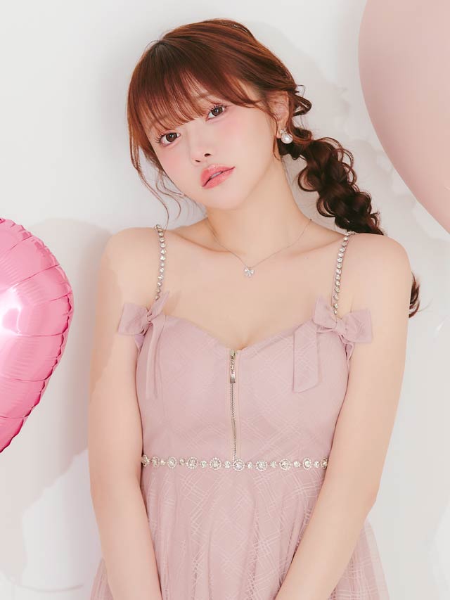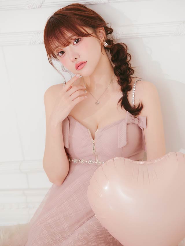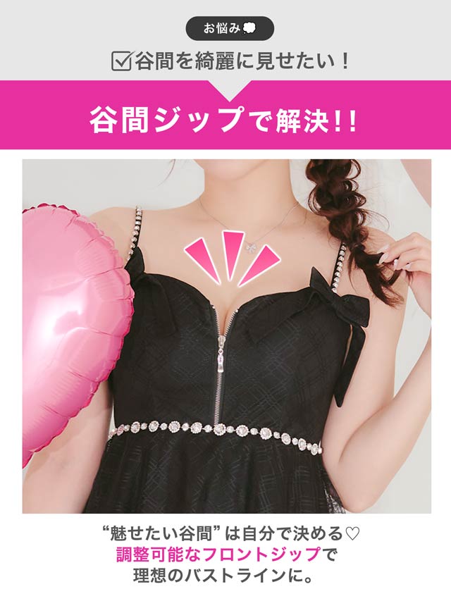 チェック柄&リボンのガーリーなデザインに、きらめくビジューで高級感をプラスしたキャバドレス。甘めな印象ながら、フロントジップで胸元の露出を調節してセクシーさも演出できちゃいます◎ふんわり広がるAラインスカートが気になるお尻まわりをカバーしてくれるのもポイント!