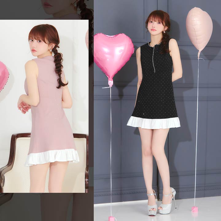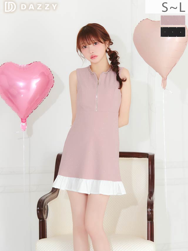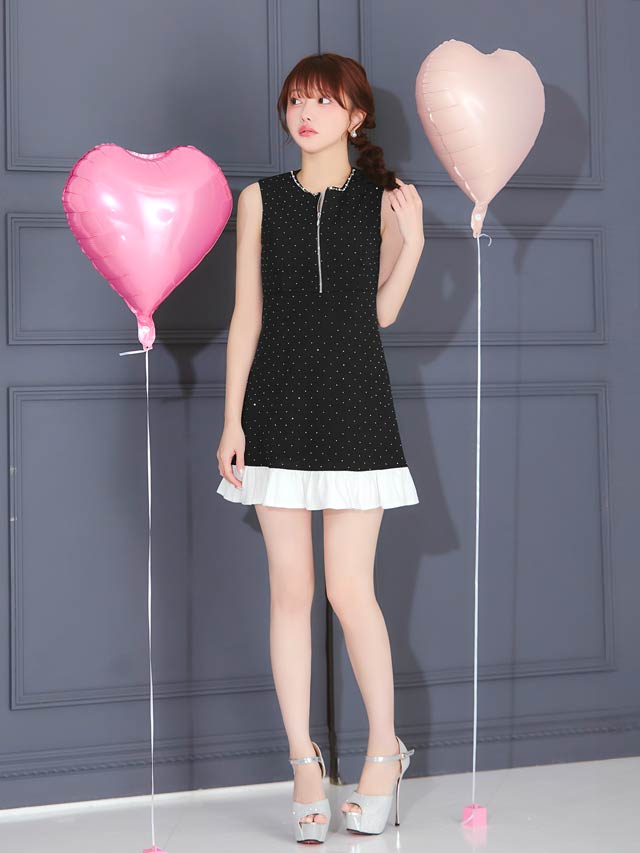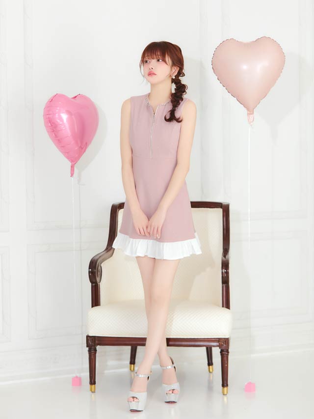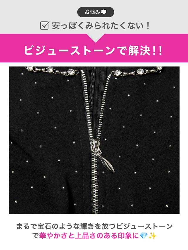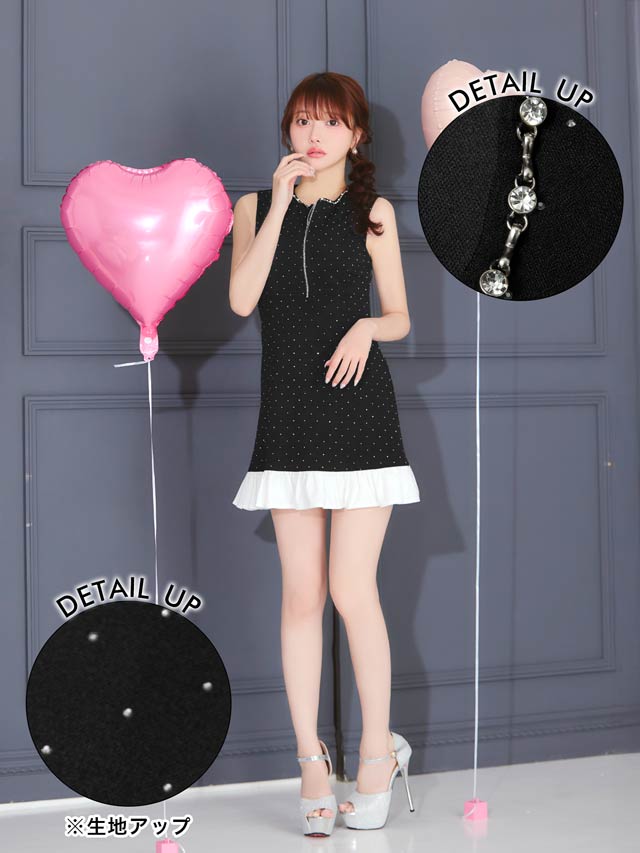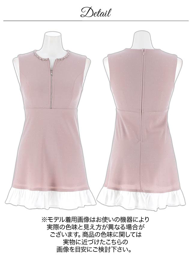 きらきらと輝くビジューストーンが華やかさを引き立てる上品可愛いキャバドレス。フロントジップを調節して、胸元の見せ方をお好みで変えられるのがポイント!裾のフリルがふんわりとした動きをプラスし、女性らしいシルエットを演出してくれる一着です。