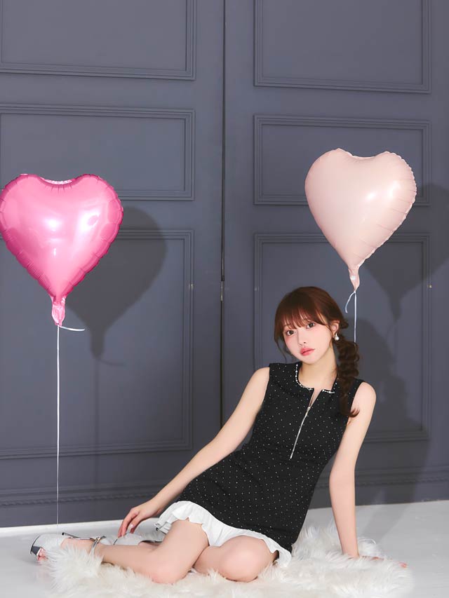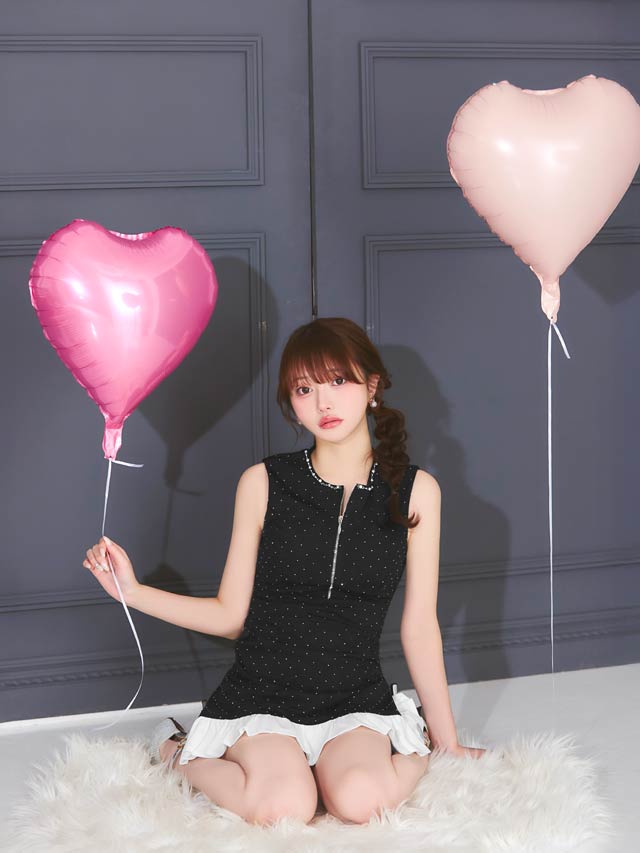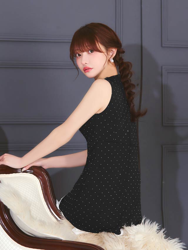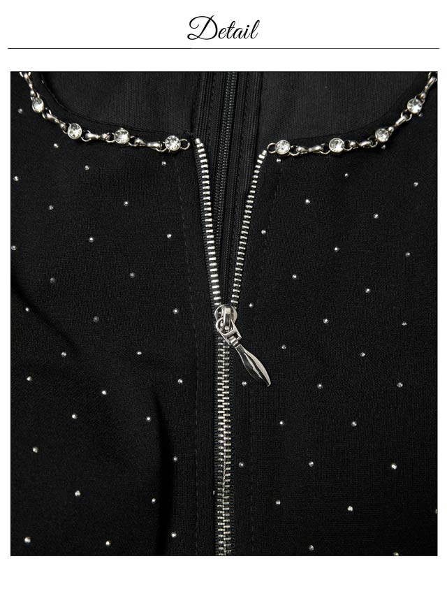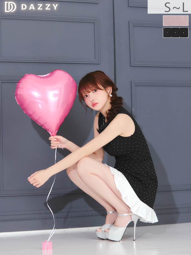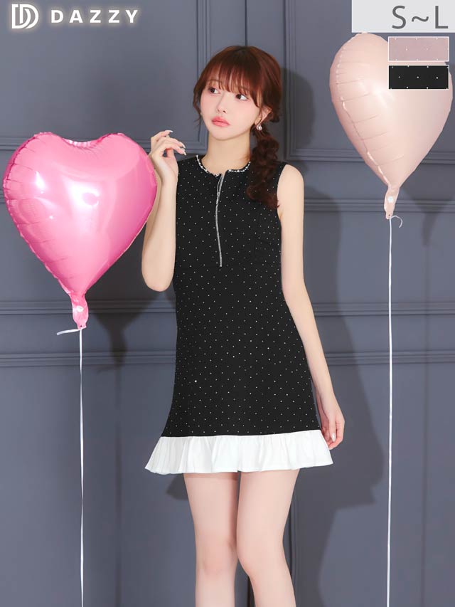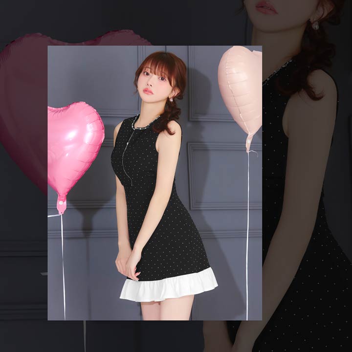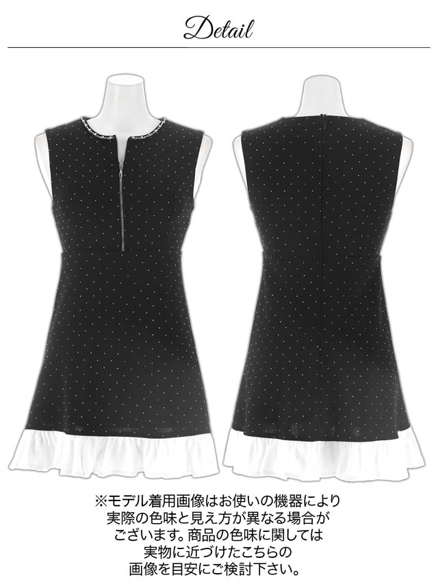 きらきらと輝くビジューストーンが華やかさを引き立てる上品可愛いキャバドレス。フロントジップを調節して、胸元の見せ方をお好みで変えられるのがポイント!裾のフリルがふんわりとした動きをプラスし、女性らしいシルエットを演出してくれる一着です。
