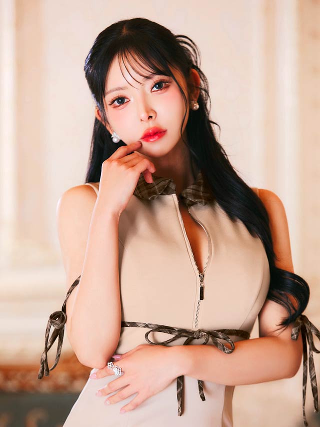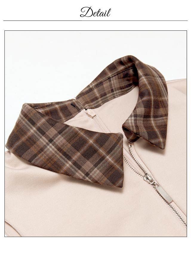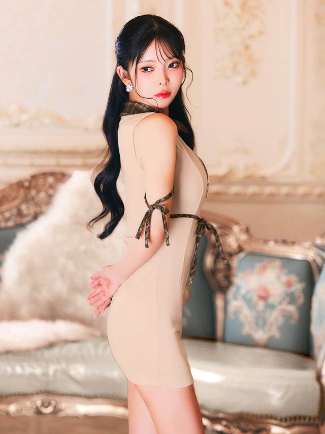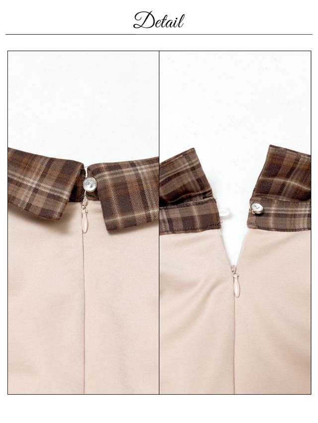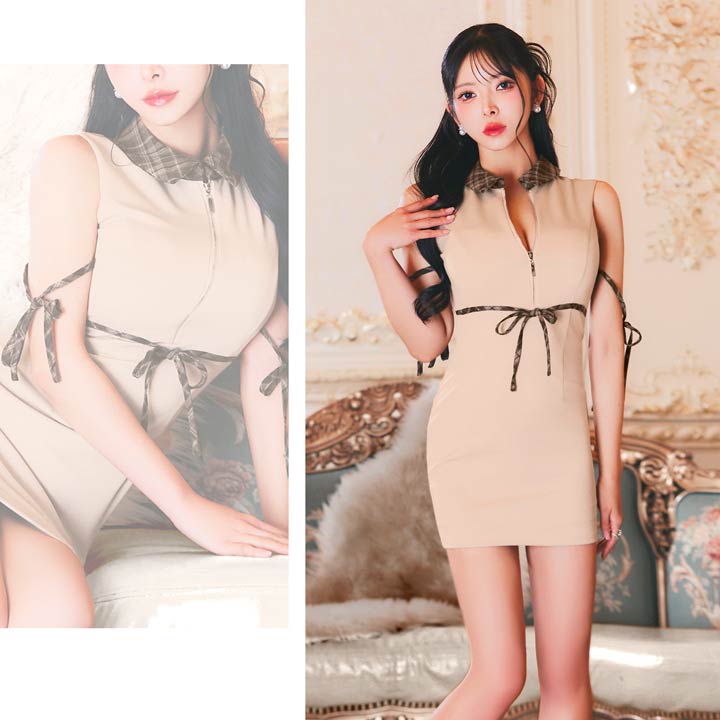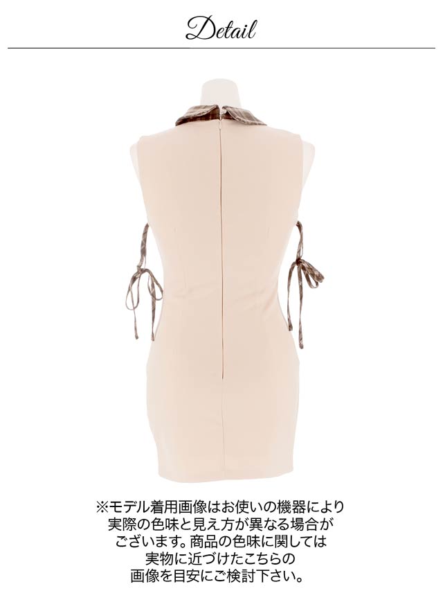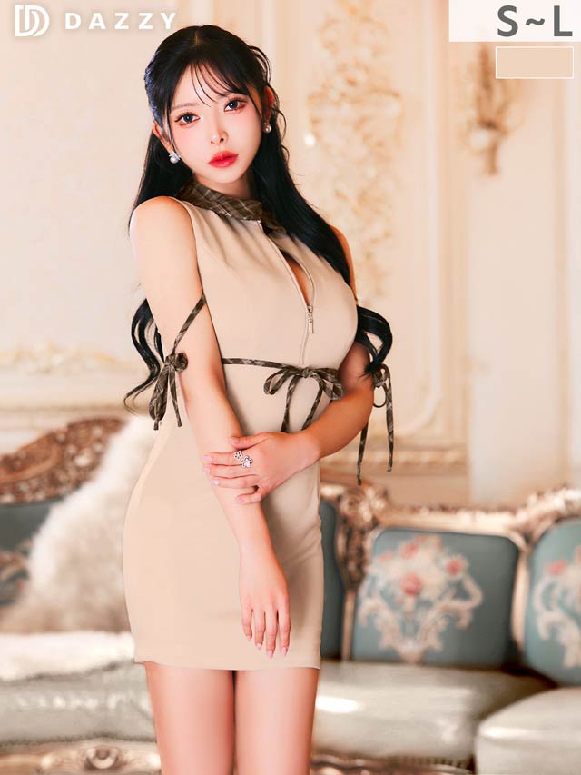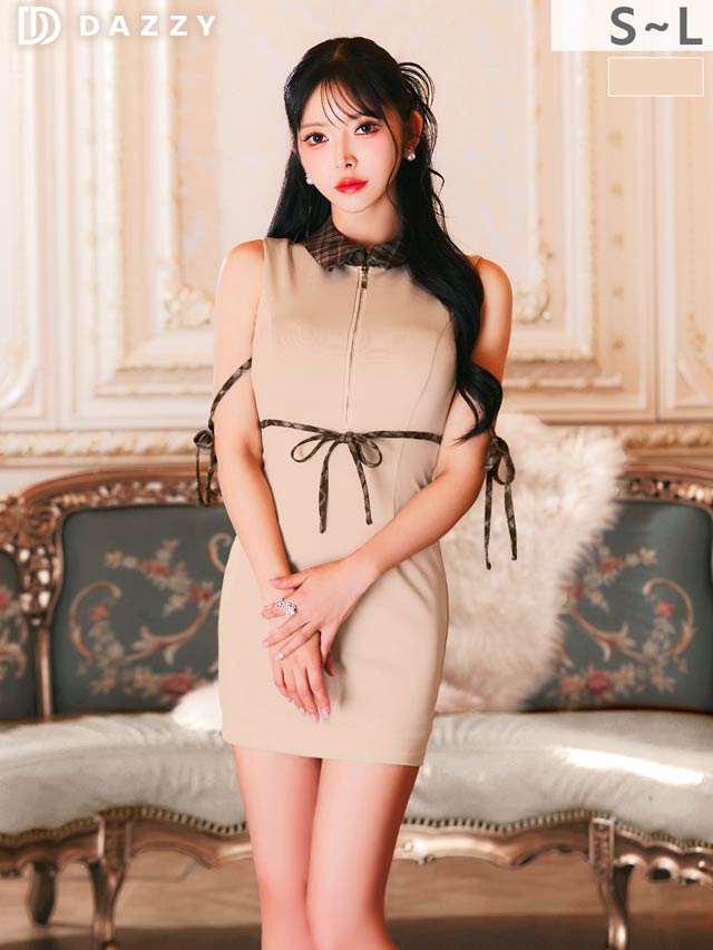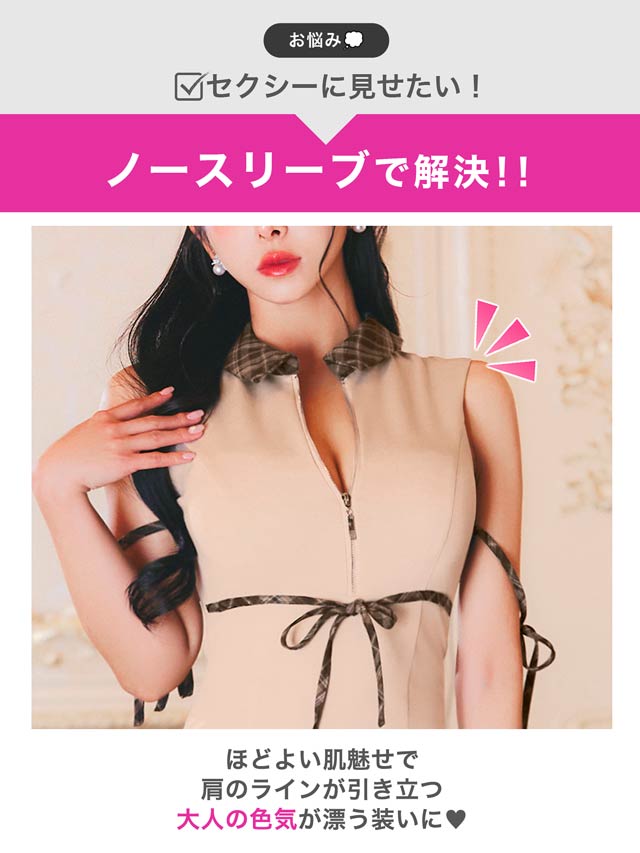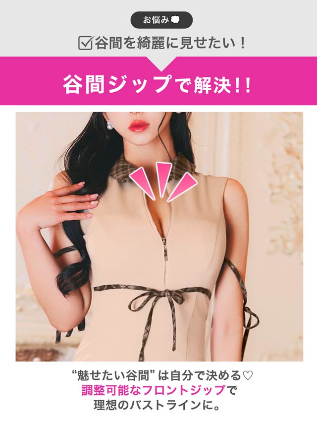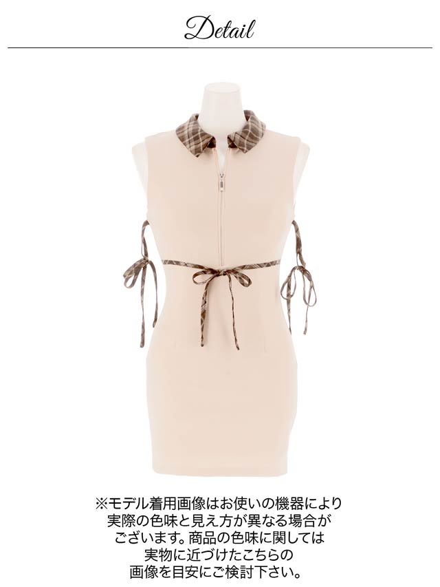 チェック柄の襟とリボンがアクセントになった、上品さと可愛さを兼ね備えたキャバドレス。フロントジップを調節して、露出を控えめにしたり色っぽく谷間魅せしたりお好みの着こなしが可能◎リボンのウエストマークで脚長効果も期待できる1着です♪