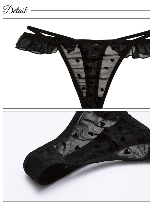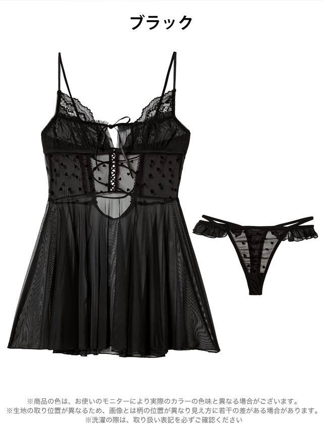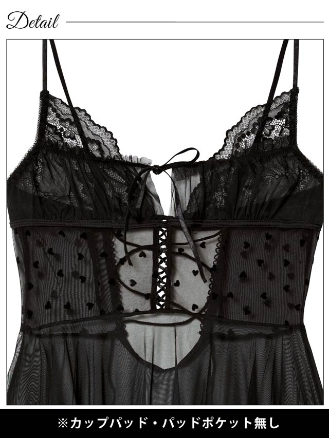 ハートドット柄のチュールが甘さの中にさりげない色っぽさを添えるベビードール。背中にはレースアップを施し、後ろ姿まで印象的なデザインに◎セットのTバックショーツはサイドフリル仕様で、可愛らしさも忘れない仕上がりです♪