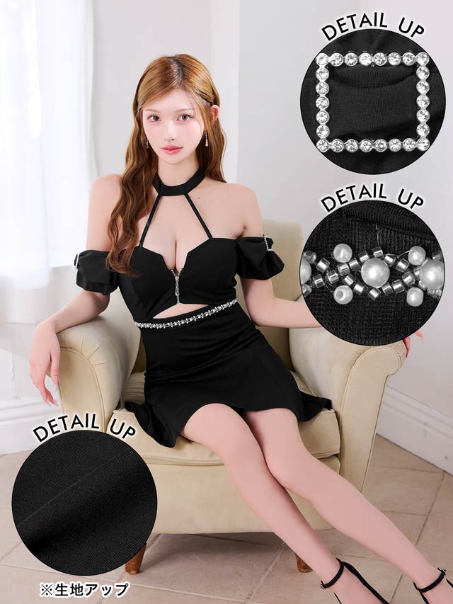 こなれ感漂うアメスリコードにファスナー仕様が大人セクシーなキャバドレス。大胆なウエストカットでくびれラインを美しく演出します◎ ビジューを加えたオフショルで甘すぎない高見えな印象も与えてくれる1着です。