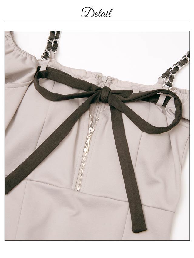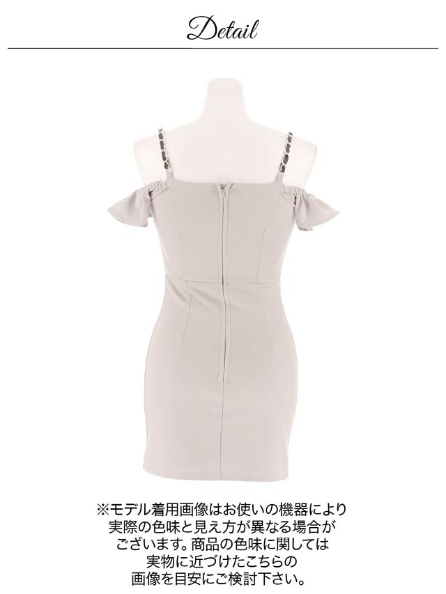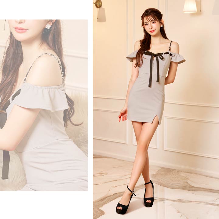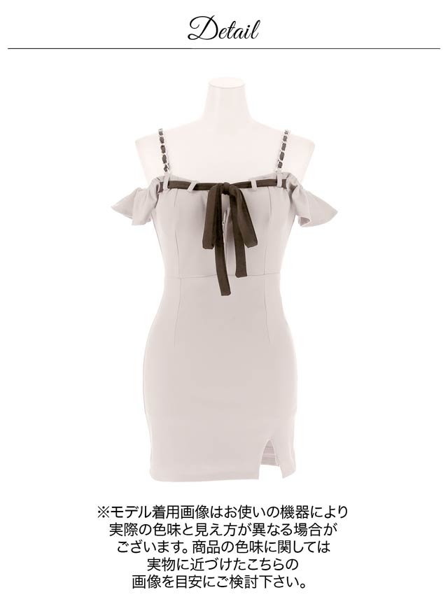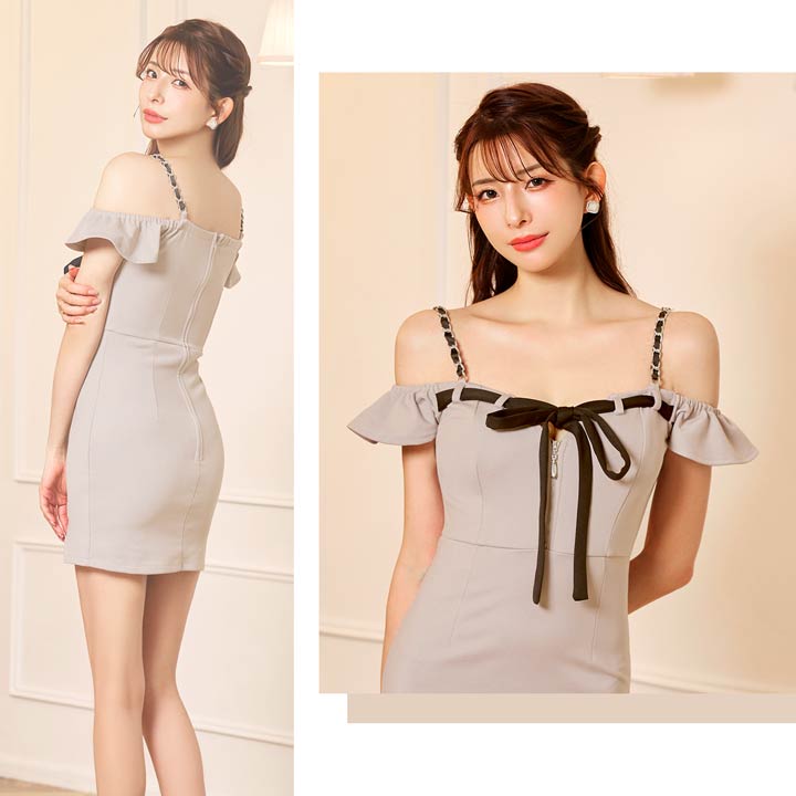 デコルテ部分にあしらわれたリボンが甘めセクシーなキャバドレス。可愛らしいフリルオフショルにチェーンの肩紐で肩幅を華奢に見せてくれます◎ さり気なく二の腕周りをカバーしてくれるのもおすすめポイントです。