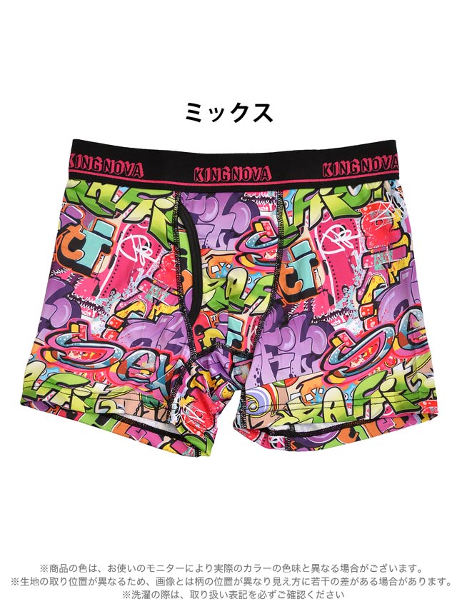 全面にグラフィティ柄をプリントしたアーティスティックなボクサーパンツ。カラフルで個性的なデザインはプレゼントにもぴったり!伸びのいい薄手の生地でストレスフリーな履き心地です◎