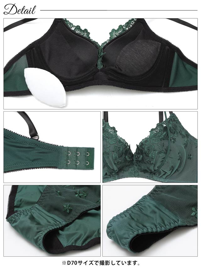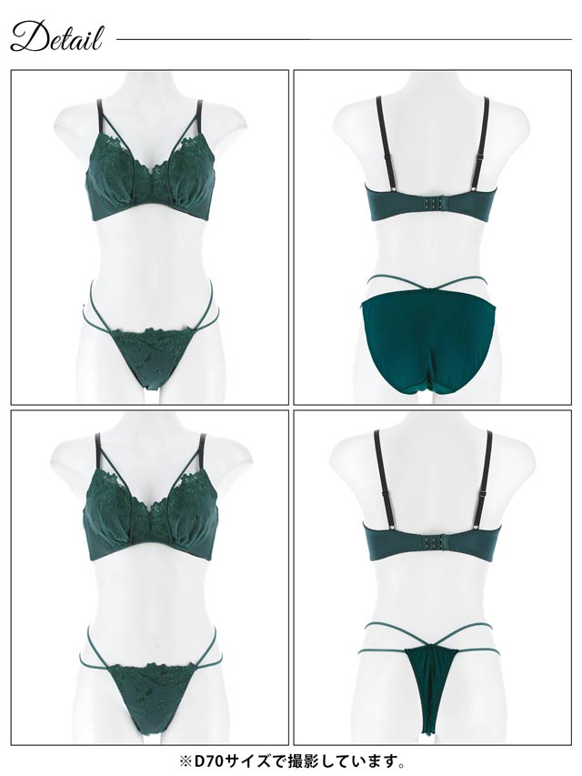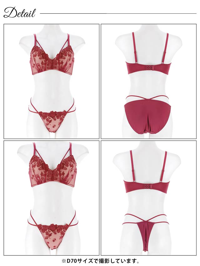 優美なフラワー刺繍とシックなカラーが、上品で大人な印象を与えるランジェリー。胸元と腰元にあしらったコードデザインアクセントになり、さりげなくセクシーさをプラス。フルバックとTバックが両方ついた3点セットなので、気分やシーンに合わせて使い分けできます◎