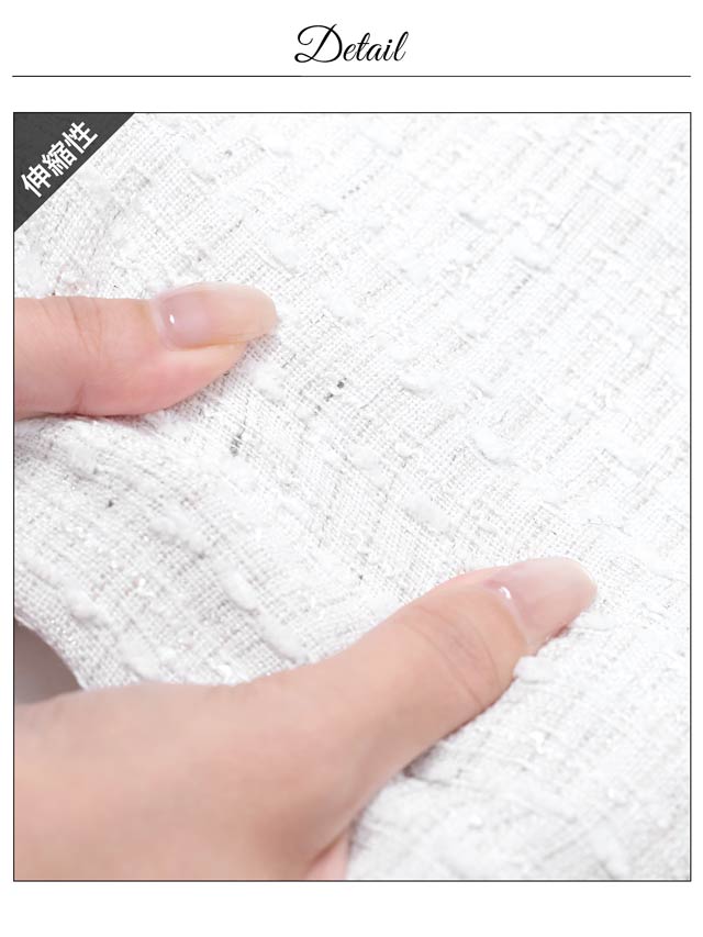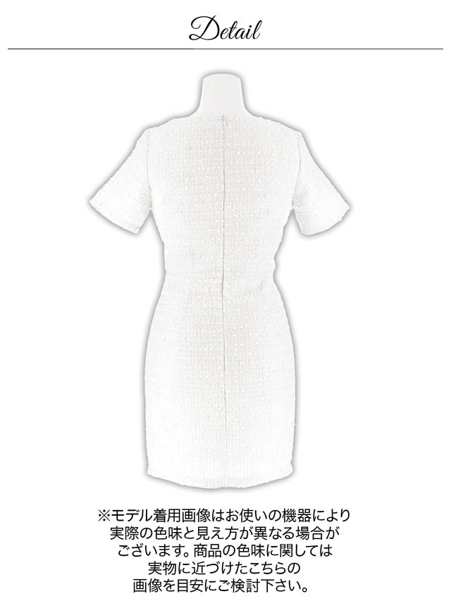 ハイランド級の存在感漂うツイードドレス。ホワイトカラーで透明感UPして美女オーラGET♪谷間ジップと大胆スリットは自由自在に調整可能だから勝負の日は大胆に攻めちゃおう。