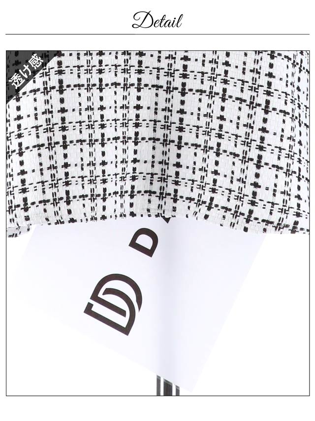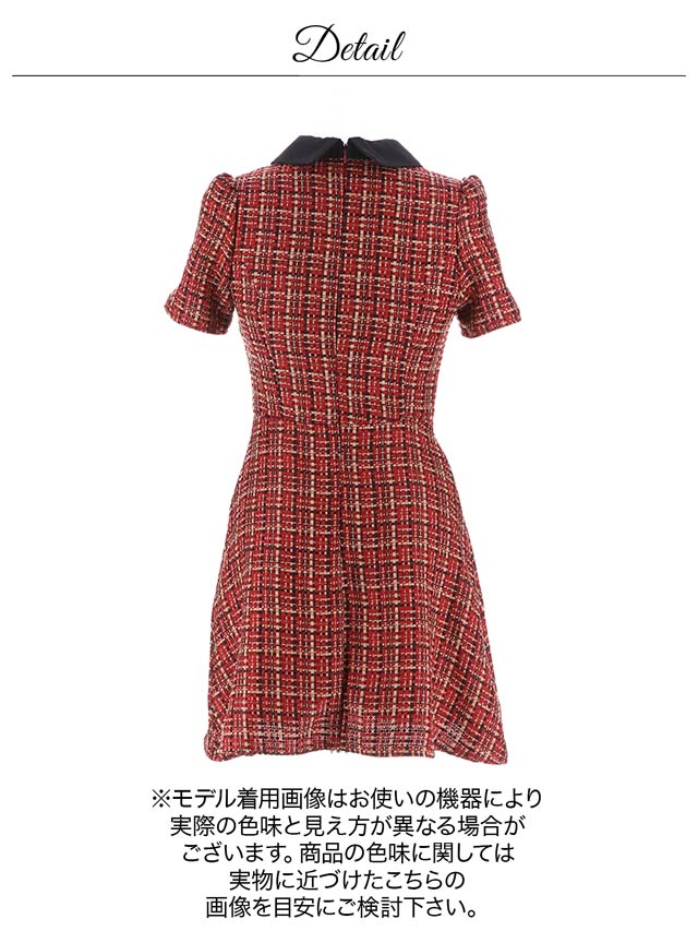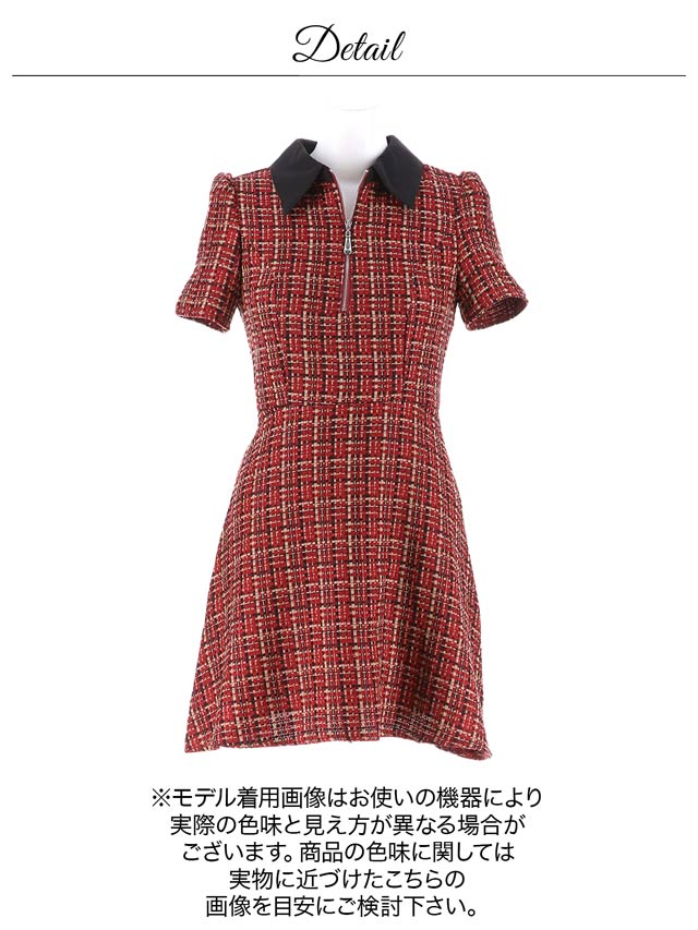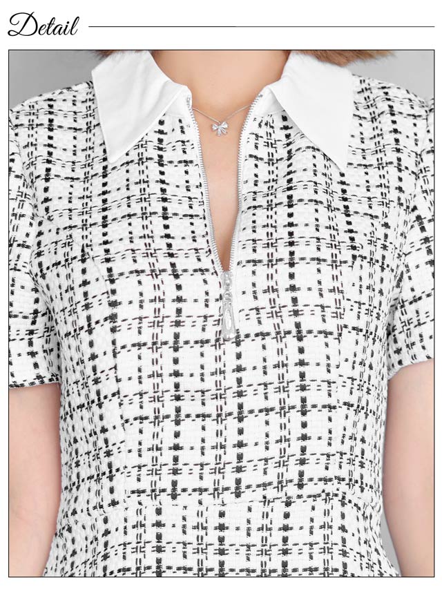 デザイン性溢れる全面ツイード素材のチェック柄がお洒落なミニドレス。襟付き仕様の上品さと、フロントジップの色っぽさが大人な女性らしい印象を与えてくれます◎ 半袖仕様で二の腕周りをさり気なくカバーしてくれる1着です♪
