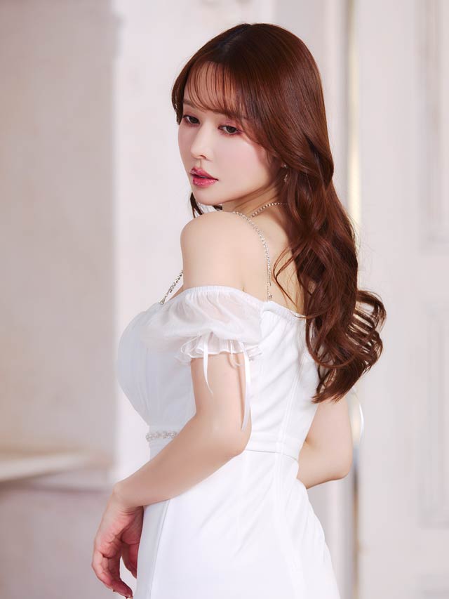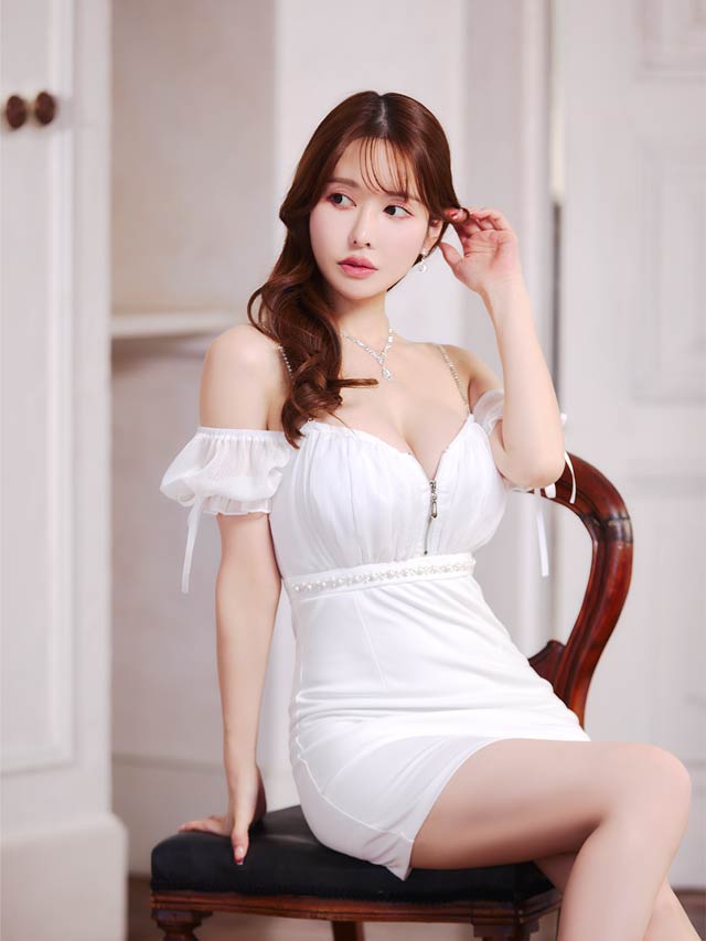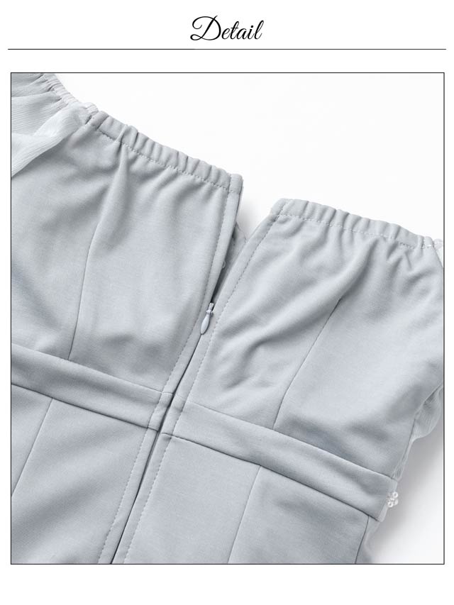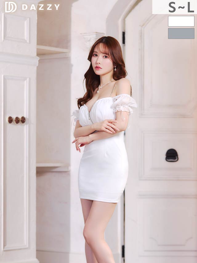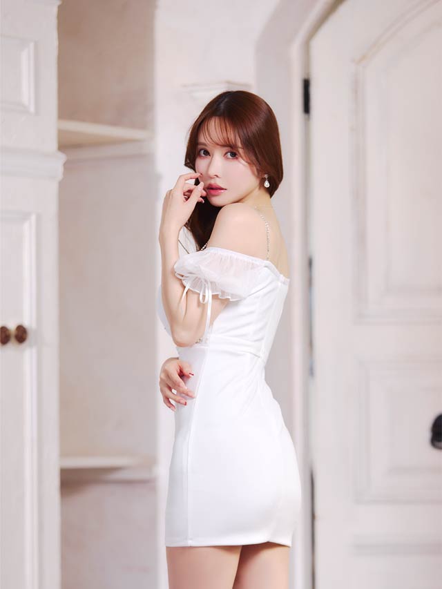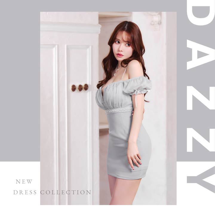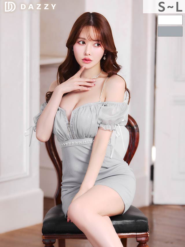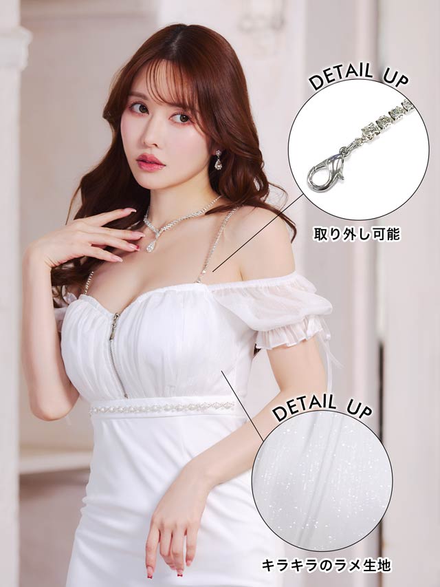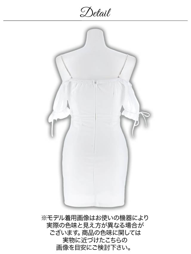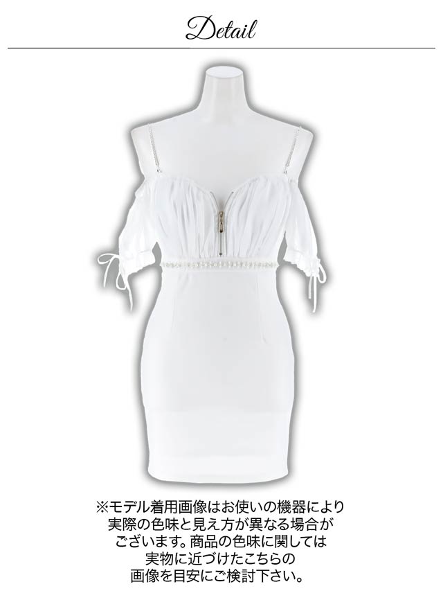 煌びやかなチェーン×オフショルがセクシーさ溢れるミニドレス。ふんわりと女性らしいシフォン素材から覗く谷間魅せが自然と視線を集めてくれる1着◎ ハイウエスト部分にあしらわれたビジューラインで高見えな印象もしっかり取り込みました♪
