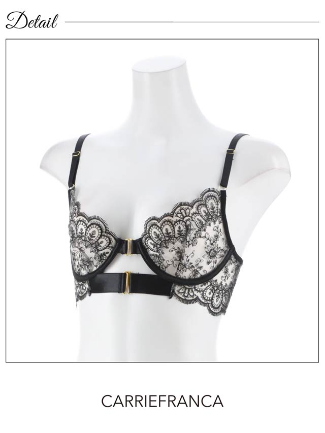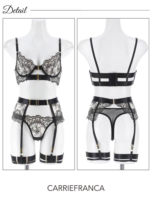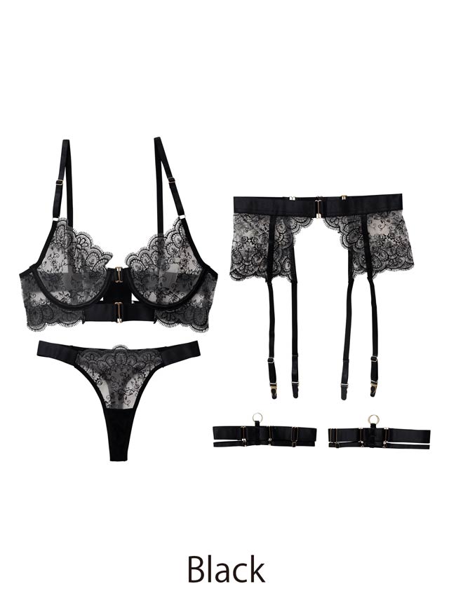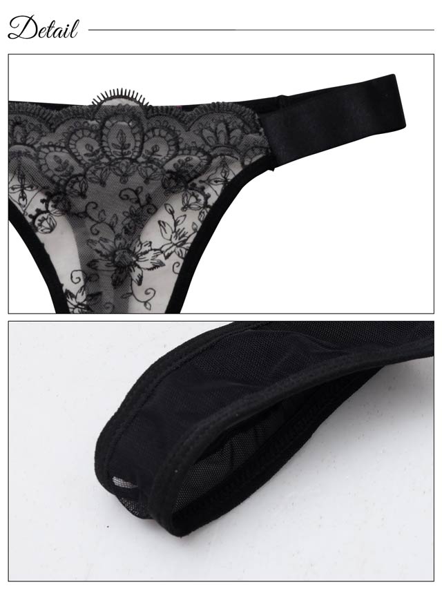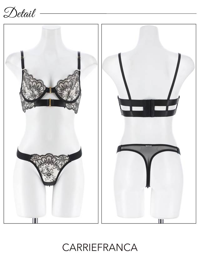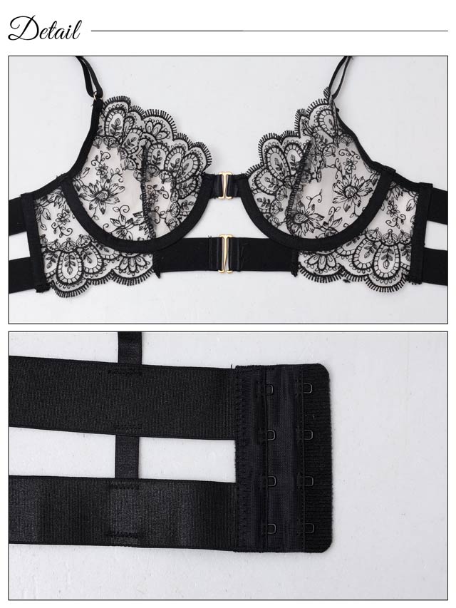 アンティークムード漂うフラワー刺繍を施した大胆な透け感のランジェリーセット。