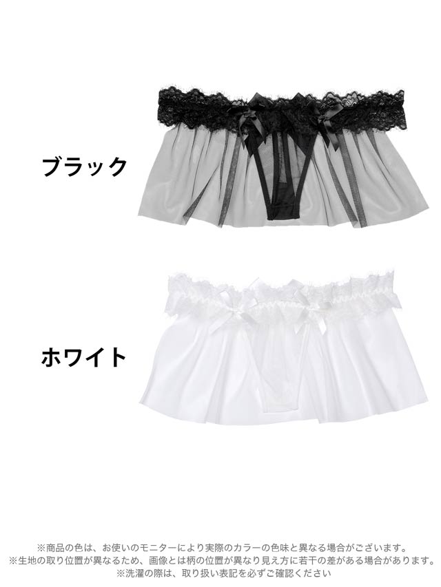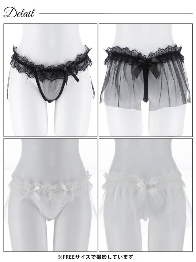 繊細なレースやリボンが腰元を可愛らしく飾るTバックショーツ。素肌が透けるシアーなデザインで甘さの中にセクシーさも感じさせます♪バックにはベールのようなチュールがあしらわれ、後ろ姿まで華やかに見せてくれる1着です◎