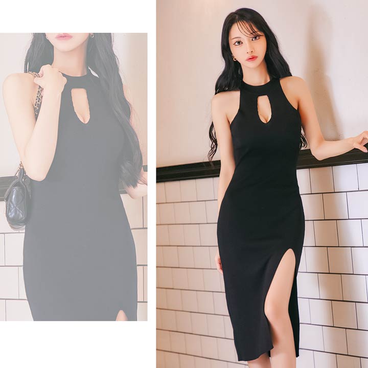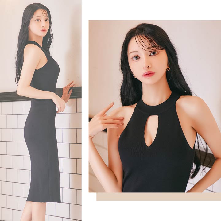 シンプルながら1枚でサマになるヘルシーなアメスリデザインのニットワンピース。バストがちらりと覗くセクシーなカットアウトが男心をくすぐるポイント◎深めのスリット入りなので足捌きが良く美脚効果も叶えてくれます