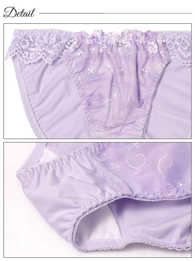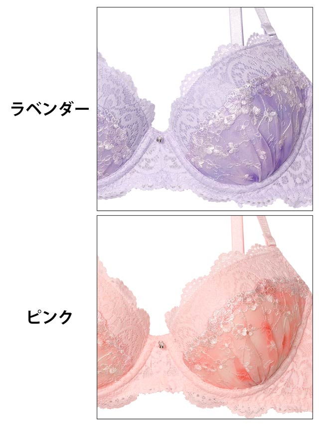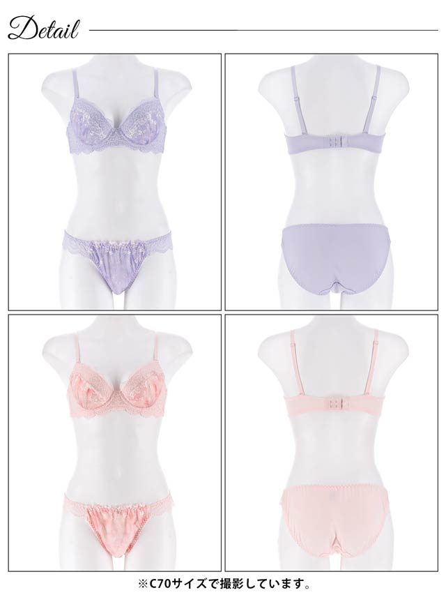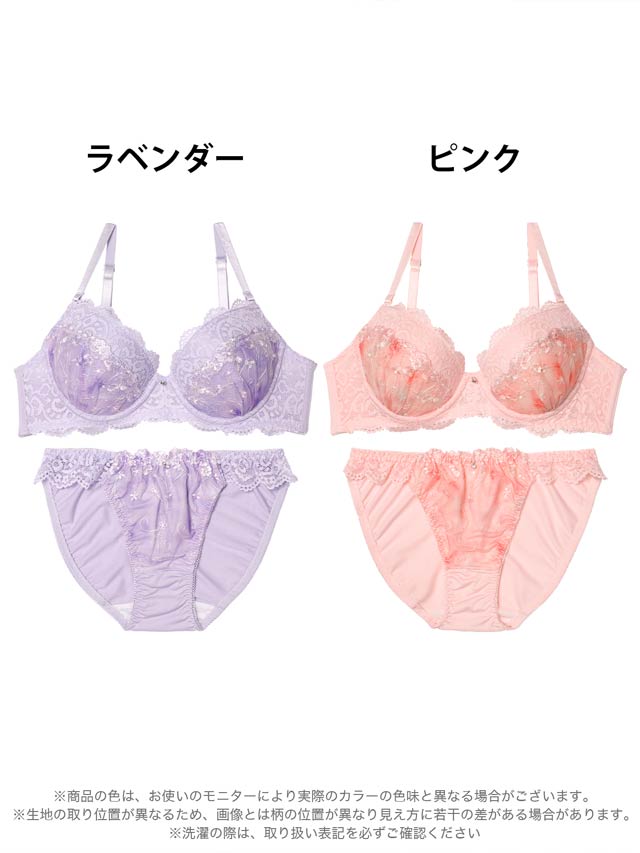 2種類の柔らかいレースとお花柄の刺繍を合わせた、乙女チックでキュートなデザインのランジェリー。レースのグラデーションや、上品にきらめくシルバーチャームがアクセントに◎ショーツのサイドは透け感のあるレースで腰元をちらりと肌見せします♪
