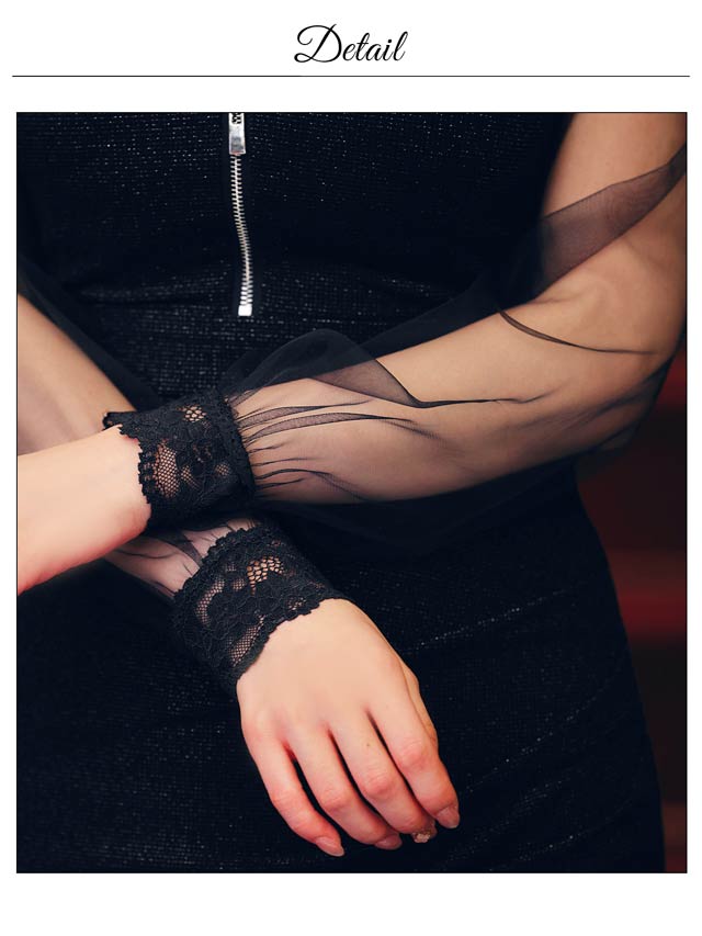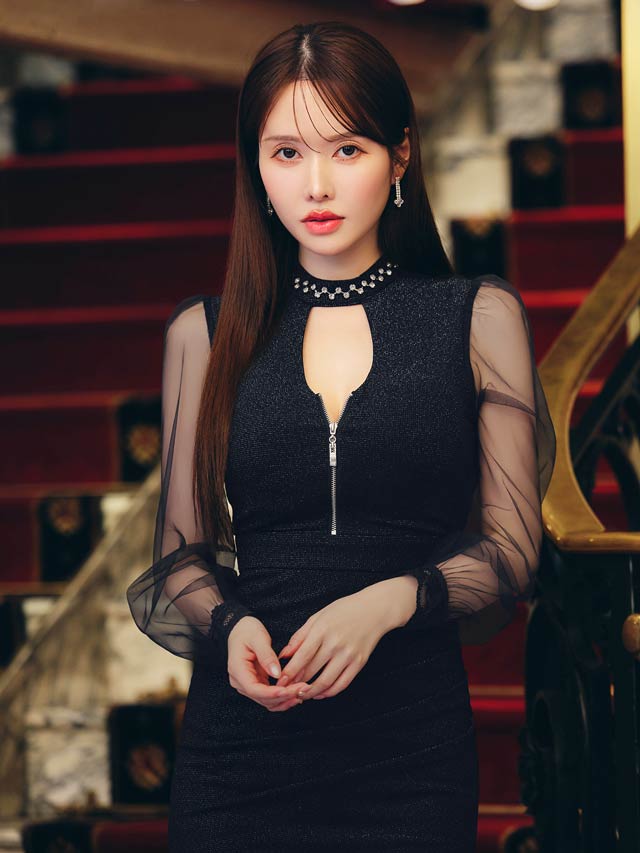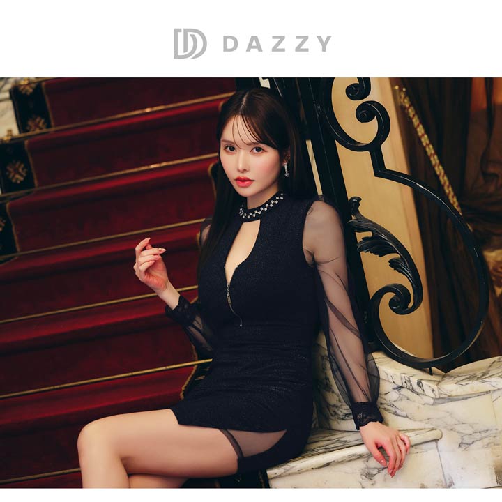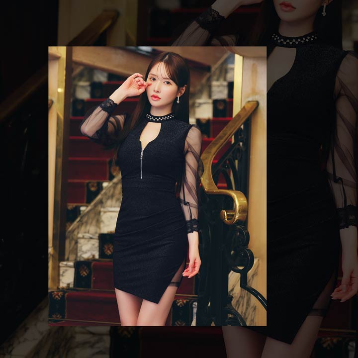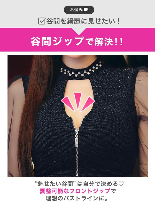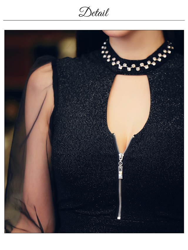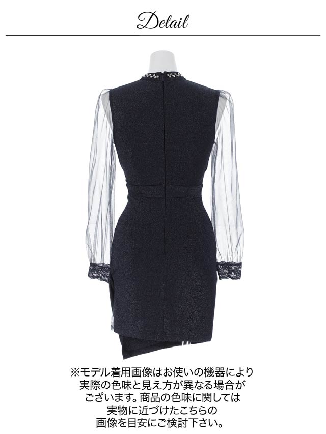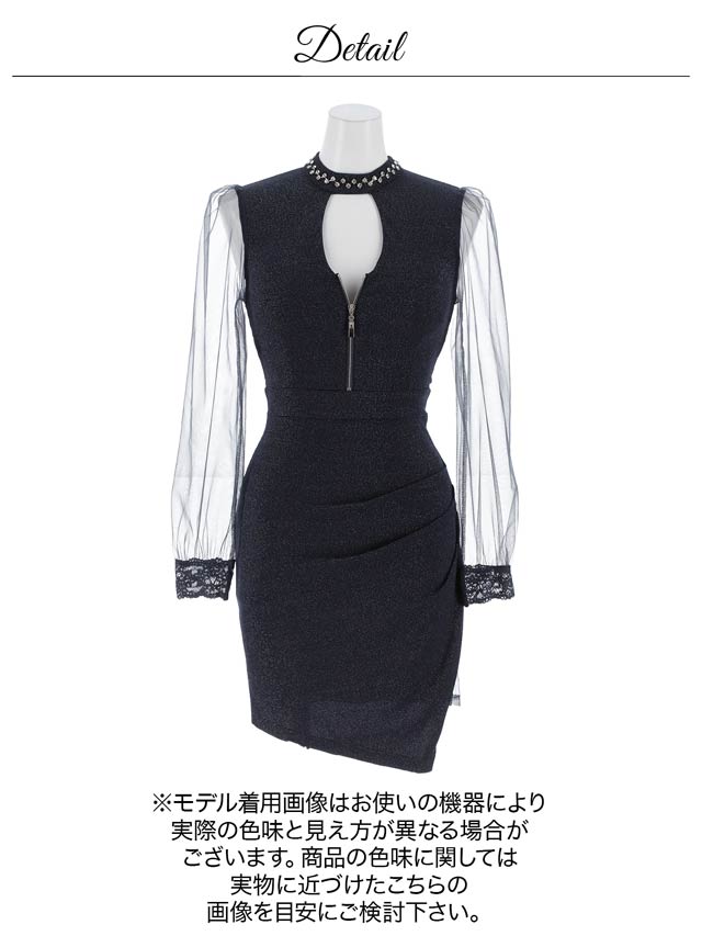 ハイネック部分にあしらわれたビジュー使いが高級感漂うミニドレス。大胆なホールデザインにフロントジップの谷間魅せが視線を釘付けに◎ アシンメトリーなスリットスカートやチュール袖が大人セクシーな演出をしてくれる1着です◎