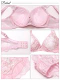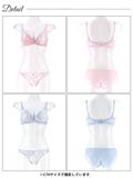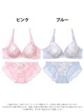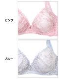 女の子らしい淡いパステルカラーに水彩フラワーを施したレース生地がキュートなランジェリー。中央で輝きを放つドロップビジューで高級感をプラスします◎ 三角ストラップと脇高構造で美バストをしっかり作り上げてくれる1着です。