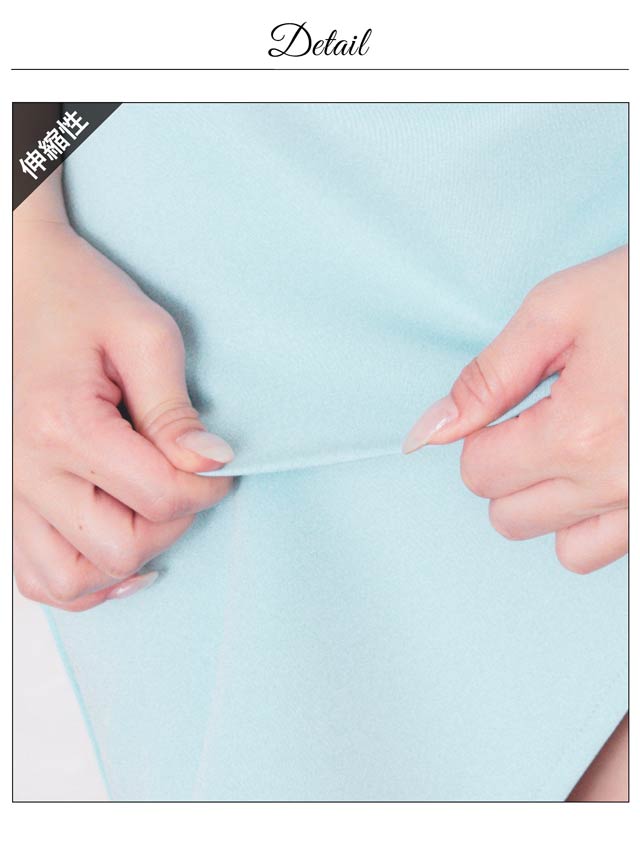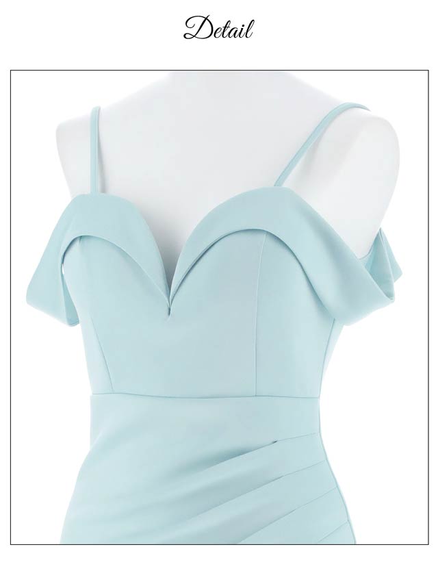 大きく開いたデコルテに谷間ラインを美しく見せてくれるハートカットがセクシーなミニドレス。ハートライン部分が崩れないようハードワイヤーを仕込み24時間綺麗なラインを保ちます。ゆったりとしたオフショルとパステルブルーの色合いが女性らしい抜け感を演出します◎ 横から見てもオシャレなギャザースリットもワンポイントです!