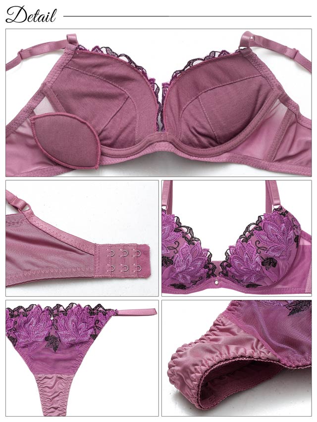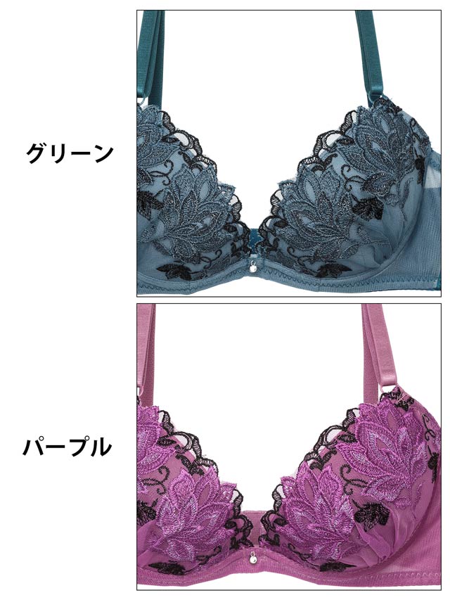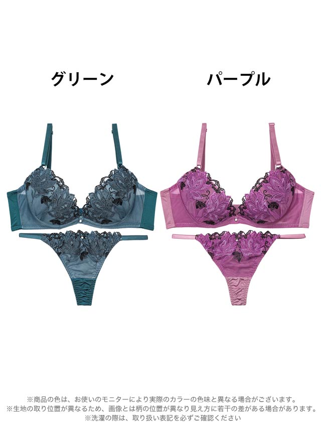 ディープカラー×ブラックのボタニカル刺繍を贅沢にあしらった高見えランジェリー。中央で揺れ動く1粒ストーンが上品な輝きを放ちます◎ 華奢なサイドストリングのショーツは大胆な肌魅せと大人セクシーな雰囲気を演出します◎