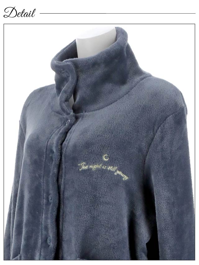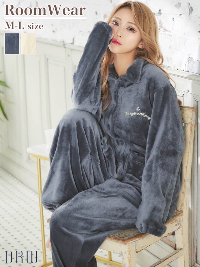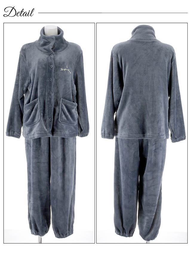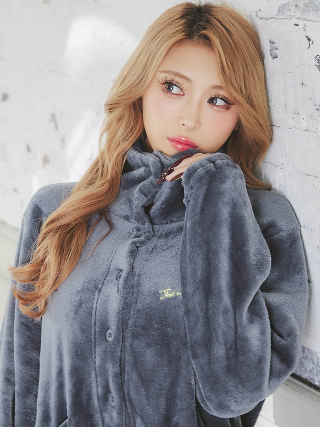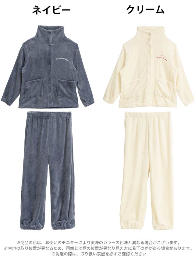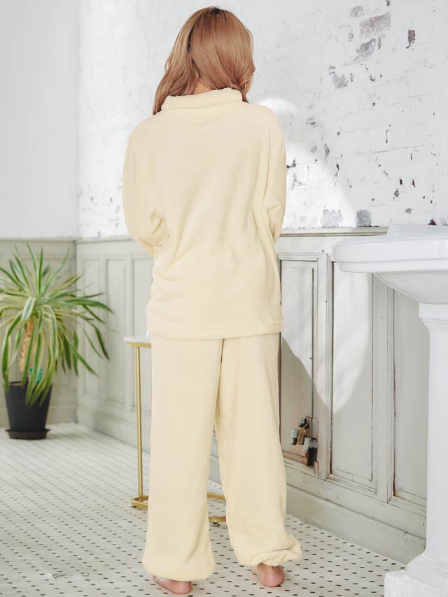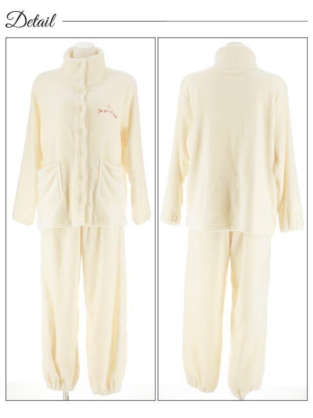 胸元のロゴ刺繍がアクセントになったふんわりモコモコ素材のトップス&ロングパンツルームウェア。ボタンを上まで留めるとハイネック仕様になり、首まわりを優しく包み込んでくれます◎冷え込む季節のおうち時間もあたたかく快適に過ごせる1着です!