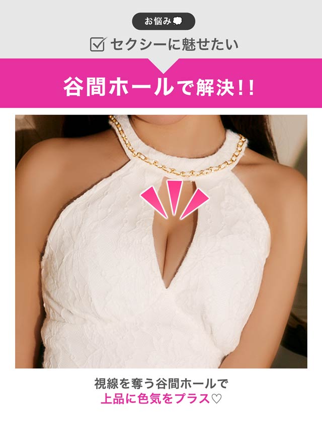 肩まわりを美しく&華奢に魅せるアメスリデザインのキャバドレス。思わず視線を奪われる大胆な谷間ホールでバストを色っぽくアピール◎で首元を飾るゴールドチェーンがさりげないアクセントになり、顔まわりに華やかさを添えてくれます♪