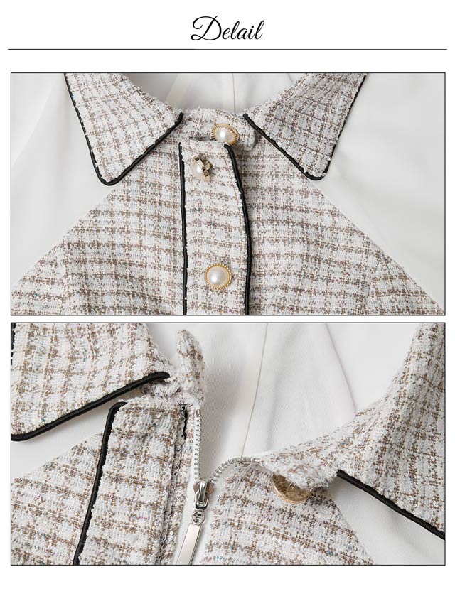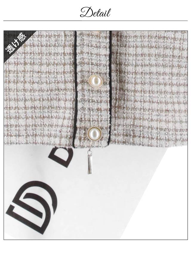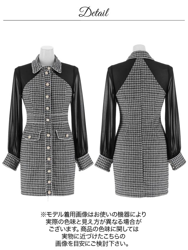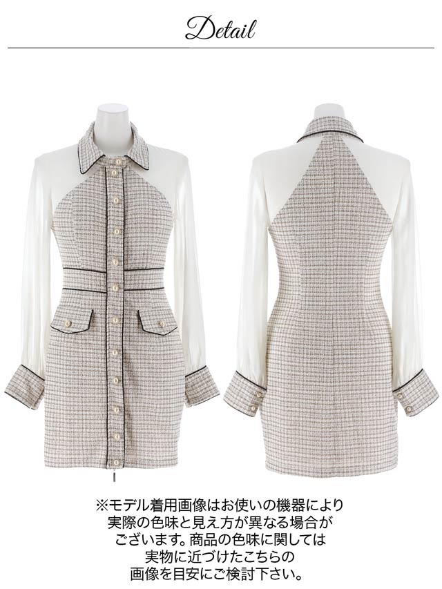 上質なツイード素材に存在感のあるパールボタンをあしらった高見えデザインのキャバドレス。ボタンは飾り仕様で、前ファスナー式だから着脱が簡単&チラ見え防止にも◎ふんわりシルエットの長袖が二の腕をさりげなくカバーし、華奢見えを叶えてくれます♪
